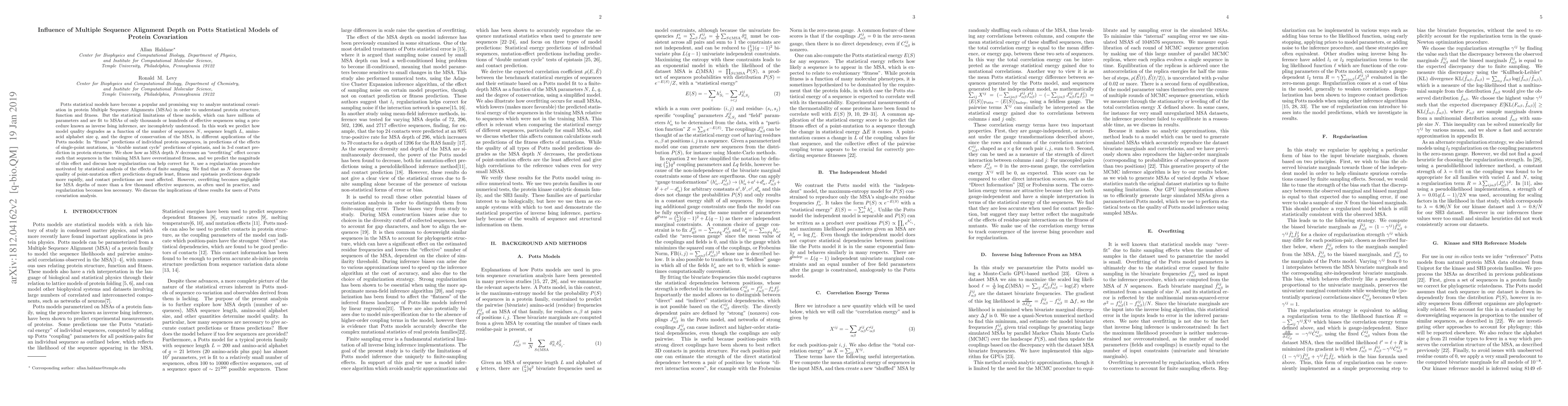 This paper investigates how the depth of Multiple Sequence Alignments (MSAs) affects Potts statistical models used for protein covariation analysis. It finds that as MSA depth decreases, overfitting occurs, degrading model predictions, especially for fitness and epistasis, but not significantly for point-mutation effects or contact predictions. Regularization can mitigate overfitting, though it becomes less critical for MSAs with thousands of effective sequences.