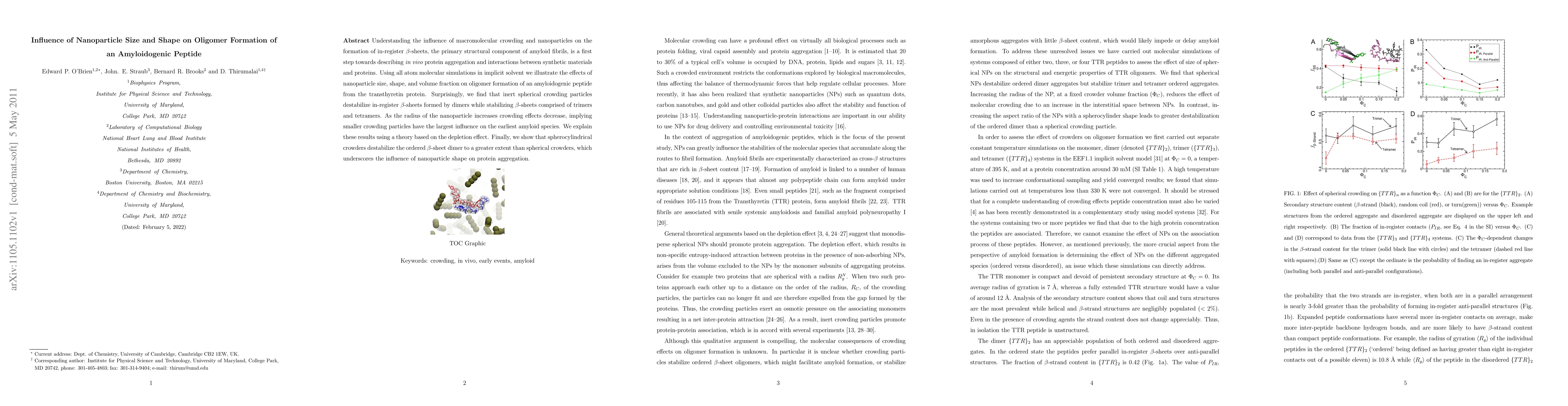 Understanding the influence of macromolecular crowding and nanoparticles on the formation of in-register $\beta$-sheets, the primary structural component of amyloid fibrils, is a first step towards describing \emph{in vivo} protein aggregation and interactions between synthetic materials and proteins. Using all atom molecular simulations in implicit solvent we illustrate the effects of nanoparticle size, shape, and volume fraction on oligomer formation of an amyloidogenic peptide from the transthyretin protein. Surprisingly, we find that inert spherical crowding particles destabilize in-register $\beta$-sheets formed by dimers while stabilizing $\beta$-sheets comprised of trimers and tetramers. As the radius of the nanoparticle increases crowding effects decrease, implying smaller crowding particles have the largest influence on the earliest amyloid species. We explain these results using a theory based on the depletion effect. Finally, we show that spherocylindrical crowders destabilize the ordered $\beta$-sheet dimer to a greater extent than spherical crowders, which underscores the influence of nanoparticle shape on protein aggregation.