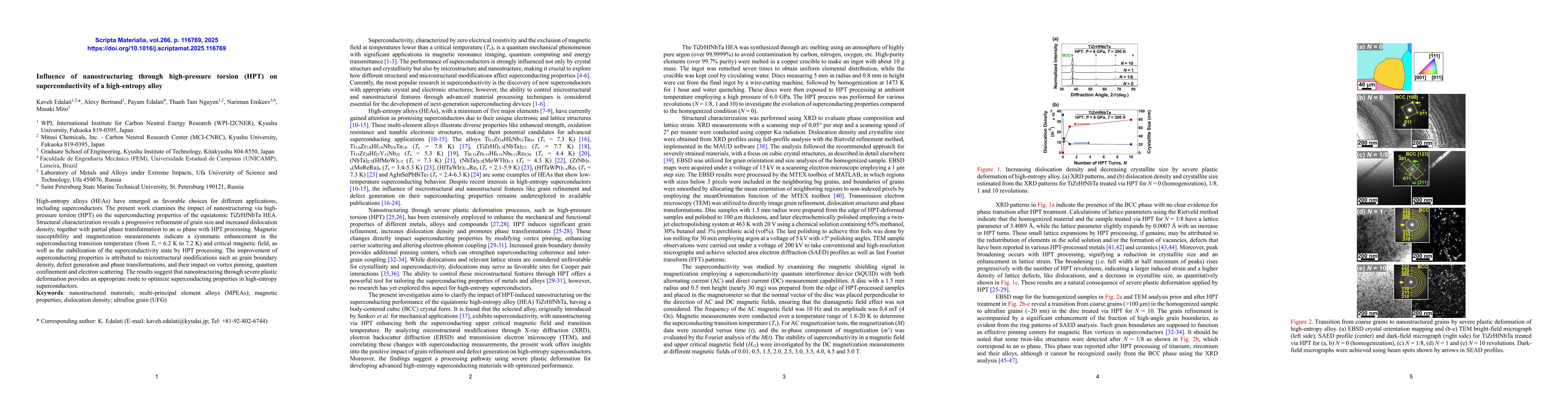 The research investigates the effect of nanostructuring using high-pressure torsion (HPT) on the superconductivity of a high-entropy alloy (HEA) TiZrHfNbTa. Results show an increase in superconducting transition temperature from 6.2 K to 7.2 K and improved critical magnetic field. This enhancement is attributed to microstructural changes like increased grain boundary density, defect generation, and phase transformations, which positively impact vortex pinning, quantum confinement, and electron scattering, suggesting HPT as a promising method to optimize superconducting properties in HEAs.
