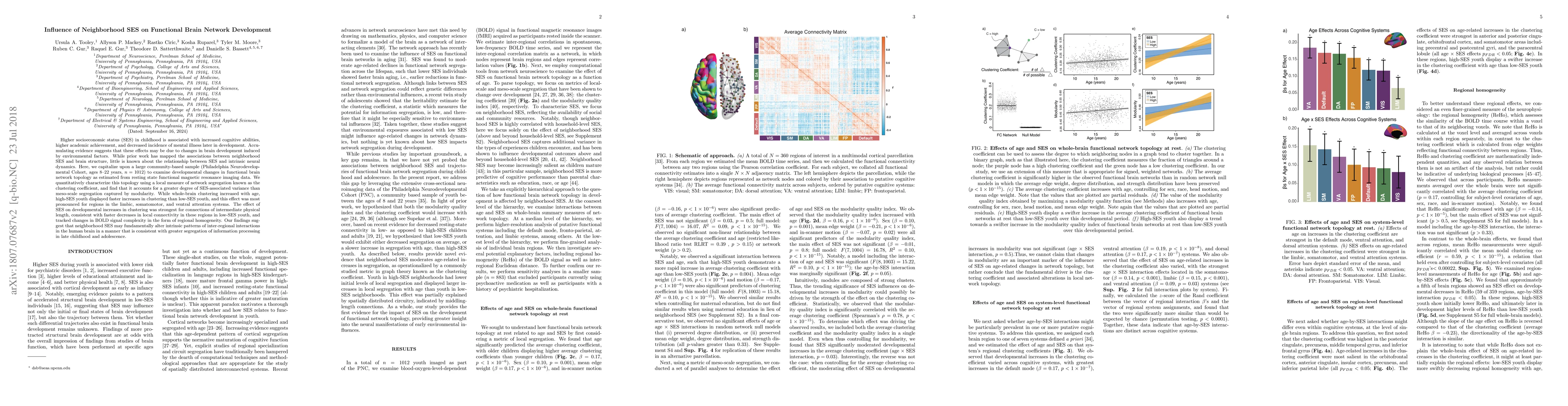 Higher socioeconomic status (SES) in childhood is associated with increased cognitive abilities, higher academic achievement, and decreased incidence of mental illness later in development. Accumulating evidence suggests that these effects may be due to changes in brain development induced by environmental factors. While prior work has mapped the associations between neighborhood SES and brain structure, little is known about the relationship between SES and intrinsic neural dynamics. Here, we capitalize upon a large community-based sample (Philadelphia Neurodevelopmental Cohort, ages 8-22 years, n=1012) to examine developmental changes in functional brain network topology as estimated from resting state functional magnetic resonance imaging data. We quantitatively characterize this topology using a local measure of network segregation known as the clustering coefficient, and find that it accounts for a greater degree of SES-associated variance than meso-scale segregation captured by modularity. While whole-brain clustering increased with age, high-SES youth displayed faster increases in clustering than low-SES youth, and this effect was most pronounced for regions in the limbic, somatomotor, and ventral attention systems. The effect of SES on developmental increases in clustering was strongest for connections of intermediate physical length, consistent with faster decreases in local connectivity in these regions in low-SES youth, and tracked changes in BOLD signal complexity in the form of regional homogeneity. Our findings suggest that neighborhood SES may fundamentally alter intrinsic patterns of inter-regional interactions in the human brain in a manner that is consistent with greater segregation of information processing in late childhood and adolescence.