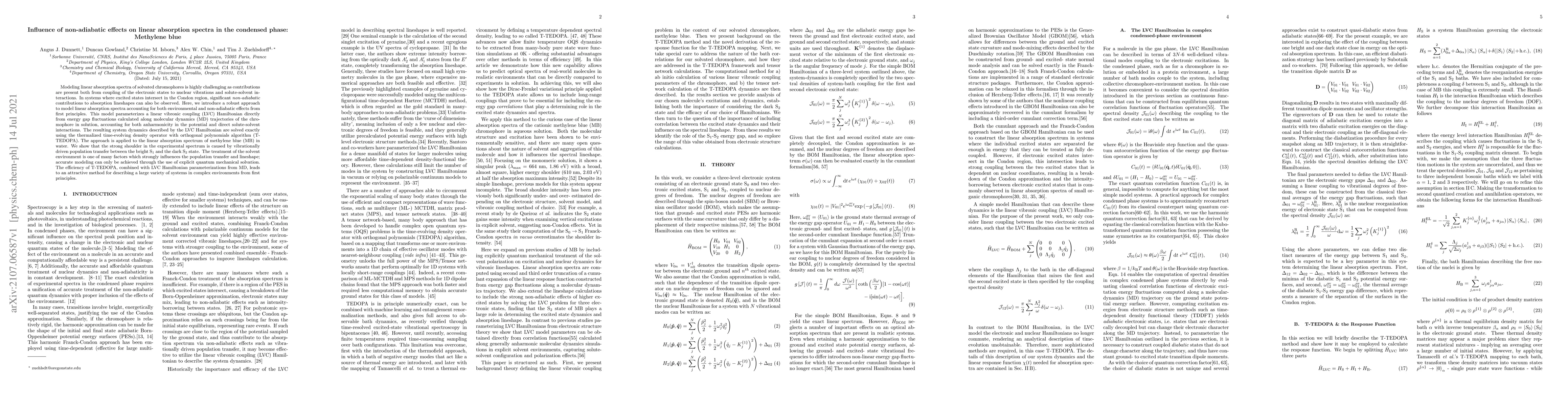 This paper presents a first-principles approach to model linear absorption spectra of solvated chromophores, accounting for non-adiabatic effects and solute-solvent interactions. The method uses a linear vibronic coupling Hamiltonian parameterized from molecular dynamics simulations and solves it with the T-TEDOPA algorithm, demonstrating its application to methylene blue in water, where it reveals the role of vibrationally driven population transfer in spectral features.