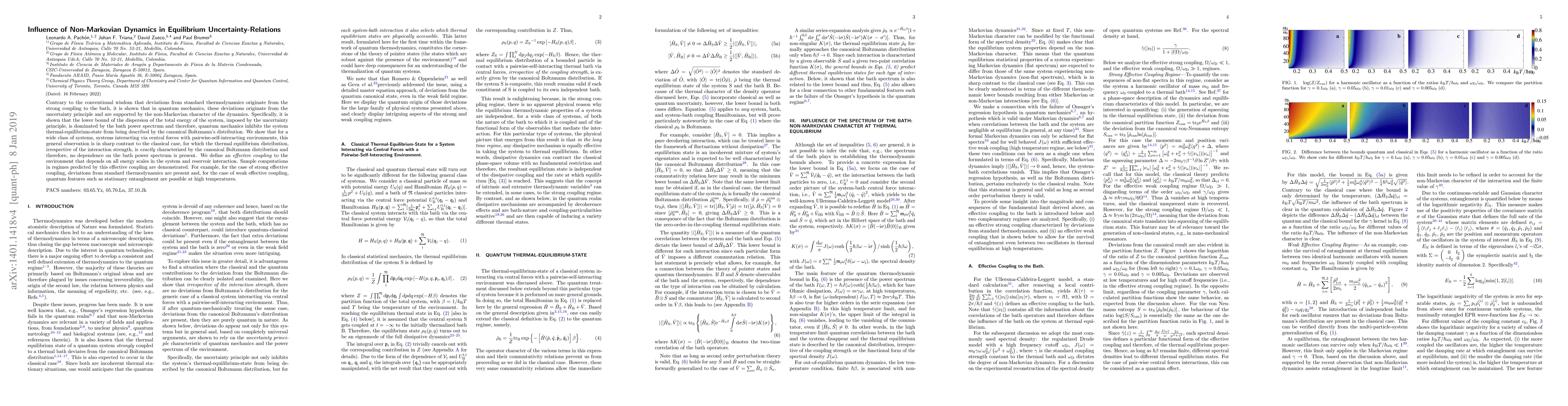 Contrary to the conventional wisdom that deviations from standard thermodynamics originate from the strong coupling to the bath, it is shown that in quantum mechanics, these deviations originate from the uncertainty principle and are supported by the non-Markovian character of the dynamics. Specifically, it is shown that the lower bound of the dispersion of the total energy of the system, imposed by the uncertainty principle, is dominated by the bath power spectrum and therefore, quantum mechanics inhibits the system thermal-equilibrium-state from being described by the canonical Boltzmann's distribution. We show that for a wide class of systems, systems interacting via central forces with pairwise-self-interacting environments, this general observation is in sharp contrast to the classical case, for which the thermal equilibrium distribution, irrespective of the interaction strength, is \emph{exactly} characterized by the canonical Boltzmann distribution and therefore, no dependence on the bath power spectrum is present. We define an \emph{effective coupling} to the environment that depends on all energy scales in the system and reservoir interaction. Sample computations in regimes predicted by this effective coupling are demonstrated. For example, for the case of strong effective coupling, deviations from standard thermodynamics are present and, for the case of weak effective coupling, quantum features such as stationary entanglement are possible at high temperatures.