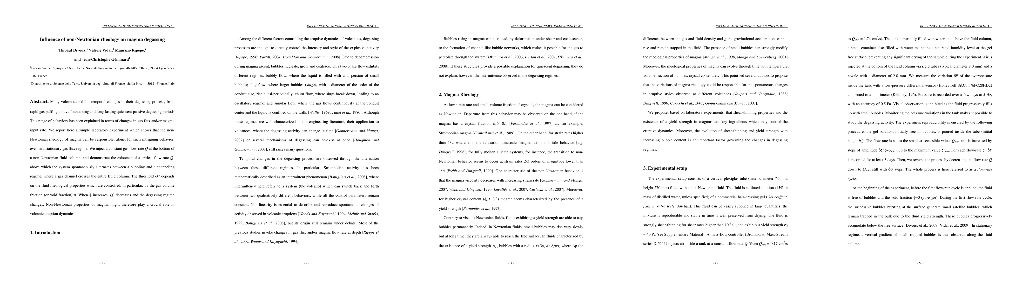 A laboratory experiment shows that non-Newtonian rheology of magma can cause it to alternate between bubbling and channeling regimes in response to changing gas flow rates, potentially affecting volcanic eruption dynamics.