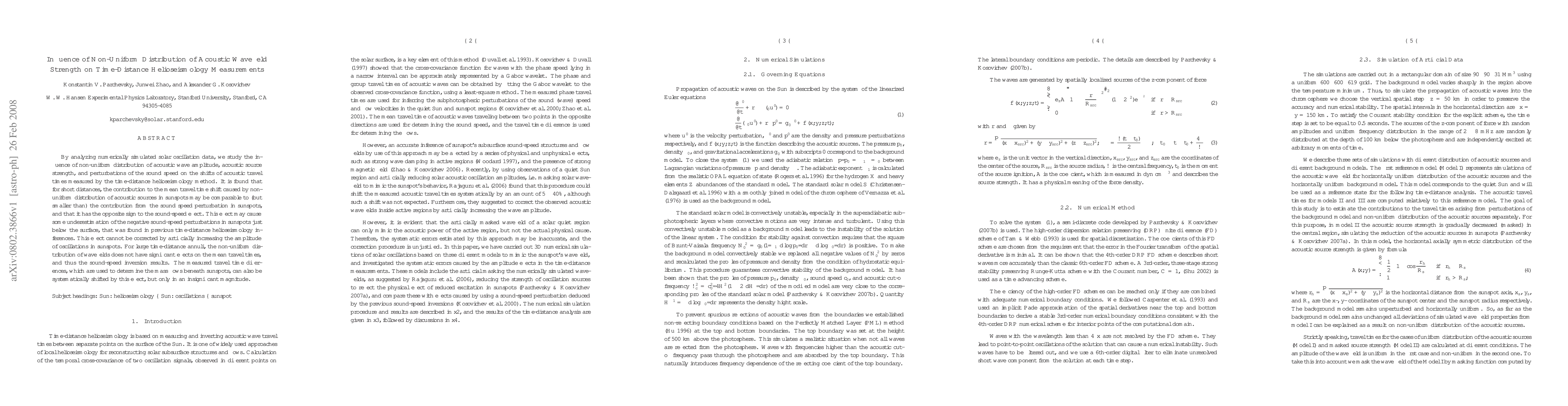 By analyzing numerically simulated solar oscillation data, we study the influence of non-uniform distribution of acoustic wave amplitude, acoustic source strength, and perturbations of the sound speed on the shifts of acoustic travel times measured by the time-distance helioseismology method. It is found that for short distances, the contribution to the mean travel time shift caused by non-uniform distribution of acoustic sources in sunspots may be comparable to (but smaller than) the contribution from the sound speed perturbation in sunspots, and that it has the opposite sign to the sound-speed effect. This effect may cause some underestimation of the negative sound-speed perturbations in sunspots just below the surface, that was found in previous time-distance helioseismology inferences. This effect cannot be corrected by artificially increasing the amplitude of oscillations in sunspots. For large time-distance annuli, the non-uniform distribution of wavefields does not have significant effects on the mean travel times, and thus the sound-speed inversion results. The measured travel time differences, which are used to determine the mass flows beneath sunspots, can also be systematically shifted by this effect, but only in an insignificant magnitude.