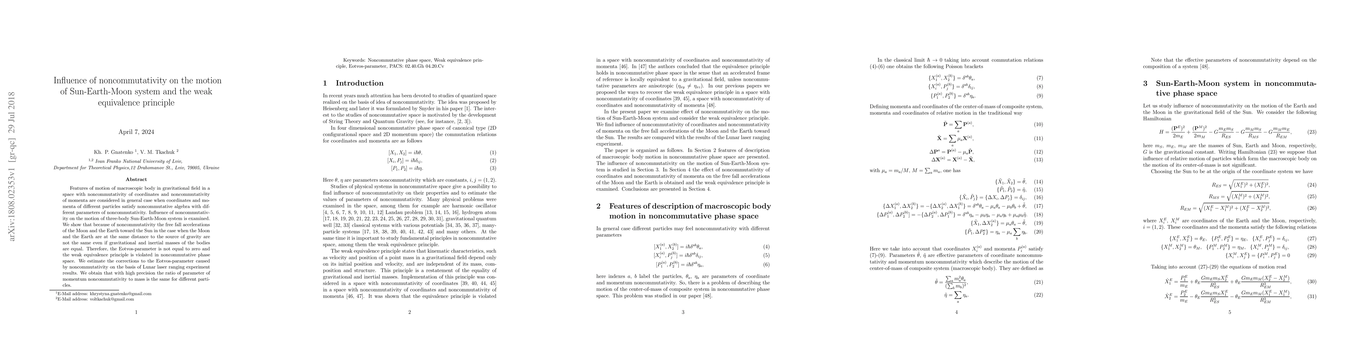 This paper investigates how noncommutativity affects the motion of the Sun-Earth-Moon system, revealing that noncommutativity violates the weak equivalence principle by causing unequal free fall accelerations for the Moon and Earth. The study estimates the resulting Eotvos-parameter corrections based on Lunar laser ranging data.