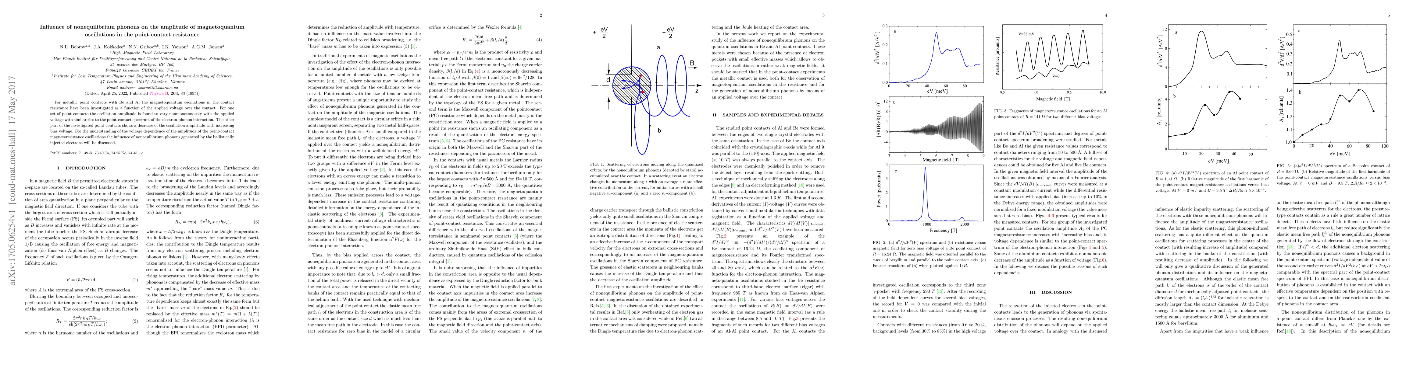 This paper investigates magnetoquantum oscillations in metallic point contacts of Be and Al, finding that the amplitude varies nonmonotonically with applied voltage in some contacts, while decreasing in others. The study explores the role of nonequilibrium phonons generated by ballistic electrons to understand the voltage dependence of these oscillations.