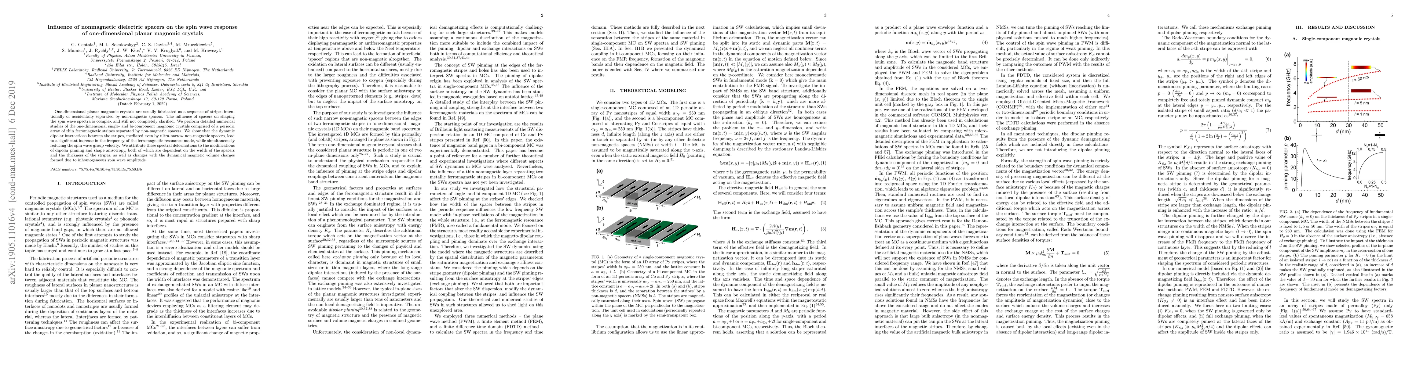 This paper investigates the impact of nonmagnetic dielectric spacers on the spin wave response in one-dimensional planar magnonic crystals. Numerical studies reveal that even ultra-narrow spacers significantly shift up the ferromagnetic resonance frequency and flatten the magnonic band by altering dipolar interactions and shape anisotropy.