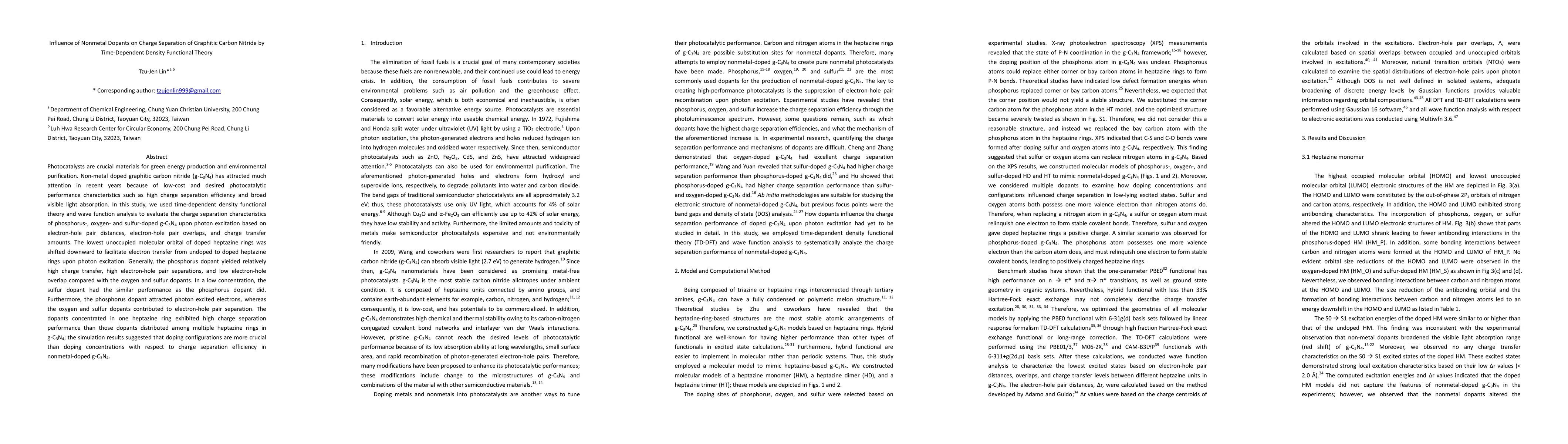 Photocatalysts are crucial materials for green energy production and environmental purification. Non-metal doped graphitic carbon nitride (g-C3N4) has attracted much attention in recent years because of low-cost and desired photocatalytic performance characteristics such as high charge separation efficiency and broad visible light absorption. In this study, we used time-dependent density functional theory and wave function analysis to evaluate the charge separation characteristics of phosphorus-, oxygen- and sulfur-doped g-C3N4 upon photon excitation based on electron-hole pair distances, electron-hole pair overlaps, and charge transfer amounts. The lowest unoccupied molecular orbital of doped heptazine rings was shifted downward to facilitate electron transfer from undoped to doped heptazine rings upon photon excitation. Generally, the phosphorus dopant yielded relatively high charge transfer, high electron-hole pair separations, and low electron-hole overlap compared with the oxygen and sulfur dopants. In a low concentration, the sulfur dopant had the similar performance as the phosphorus dopant did. Furthermore, the phosphorus dopant attracted photon excited electrons, whereas the oxygen and sulfur dopants contributed to electron-hole pair separation. The dopants concentrated in one heptazine ring exhibited high charge separation performance than those dopants distributed among multiple heptazine rings in g-C3N4; the simulation results suggested that doping configurations are more crucial than doping concentrations with respect to charge separation efficiency in nonmetal-doped g-C3N4.