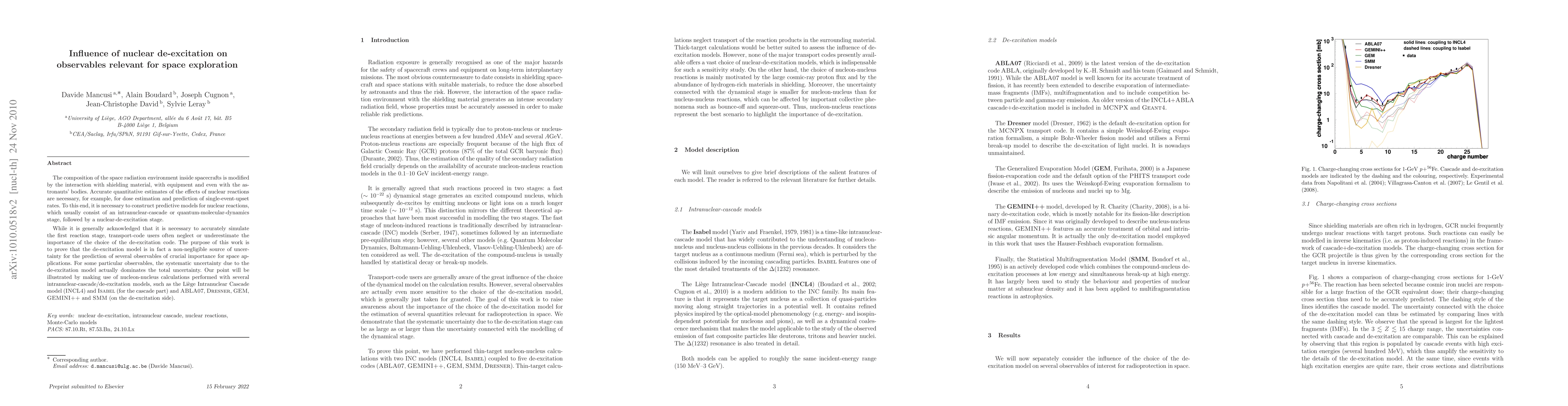 This paper investigates the impact of nuclear de-excitation models on the accuracy of predictions for space radiation environment observables, emphasizing their crucial role in determining dose estimation and single-event-upset rates. It demonstrates that the choice of de-excitation model significantly affects the uncertainty in these predictions, often dominating the total uncertainty.