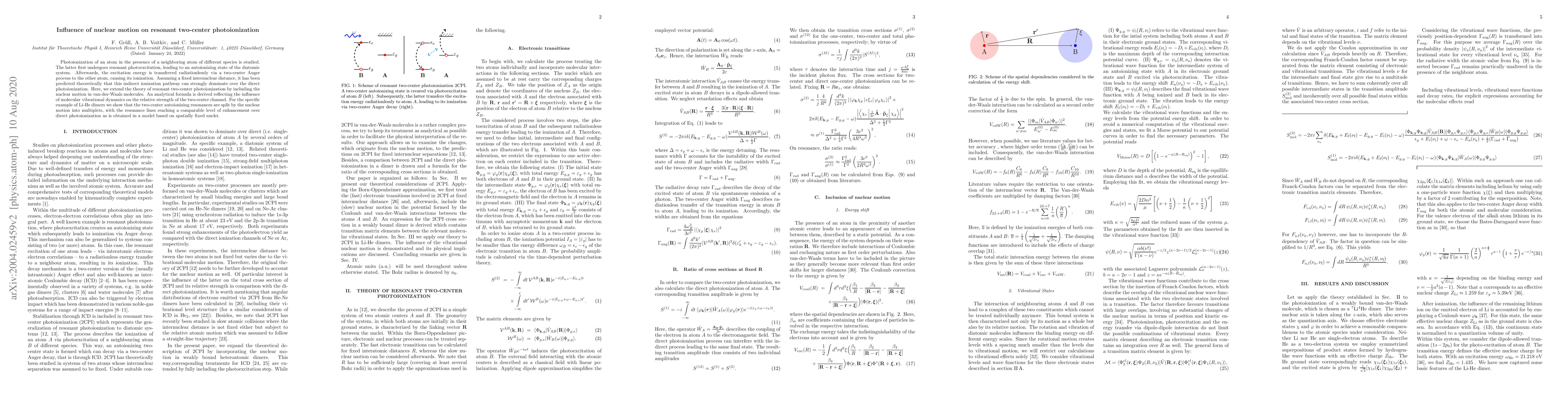 Photoionization of an atom in the presence of a neighboring atom of different species is studied. The latter first undergoes resonant photoexcitation, leading to an autoionizing state of the diatomic system. Afterwards, the excitation energy is transferred radiationlessly via a two-center Auger process to the other atom, causing its ionization. Assuming a fixed internuclear distance, it has been predicted theoretically that this indirect ionization pathway can strongly dominate over the direct photoionization. Here, we extend the theory of resonant two-center photoionization by including the nuclear motion in van-der-Waals molecules. An analytical formula is derived reflecting the influence of molecular vibrational dynamics on the relative strength of the two-center channel. For the specific example of Li-He dimers we show that the two-center autoionizing resonances are split by the nuclear motion into multiplets, with the resonance lines reaching a comparable level of enhancement over direct photoionization as is obtained in a model based on spatially fixed nuclei.