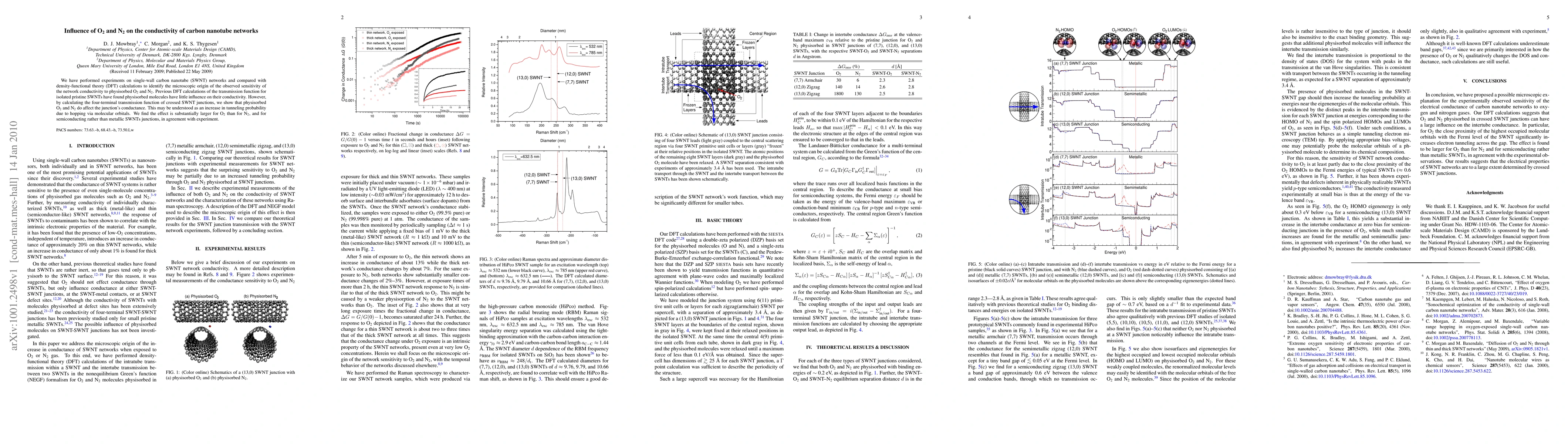 The research explores how oxygen (O2) and nitrogen (N2) molecules affect the conductivity of single-wall carbon nanotube (SWNT) networks. Using density-functional theory (DFT) calculations and experiments, it's found that these physisorbed gases significantly impact the conductance of SWNT junctions, especially for semiconducting nanotubes and oxygen molecules, due to increased tunneling probability via molecular orbitals.