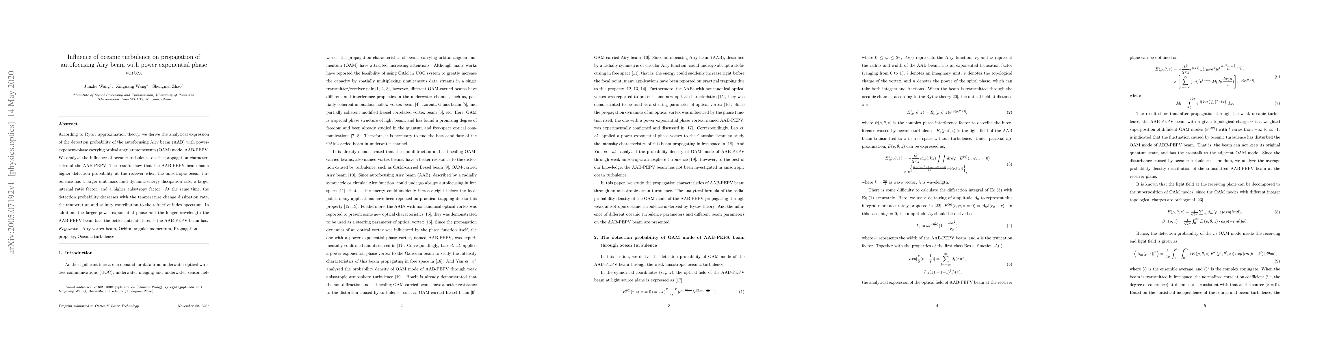 According to Rytov approximation theory, we derive the analytical expression of the detection probability of the autofocusing Airy beam (AAB) with powerexponent-phase carrying orbital angular momentum (OAM) mode, AAB-PEPV. We analyze the influence of oceanic turbulence on the propagation characteristics of the AAB-PEPV. The results show that the AAB-PEPV beam has a higher detection probability at the receiver when the anisotropic ocean turbulence has a larger unit mass fluid dynamic energy dissipation rate, a larger internal ratio factor, and a higher anisotropy factor. At the same time, the detection probability decreases with the temperature change dissipation rate, the temperature and salinity contribution to the refractive index spectrum. In addition, the larger power exponential phase and the longer wavelength the AAB-PEPV beam has, the better anti-interference the AAB-PEPV beam has.