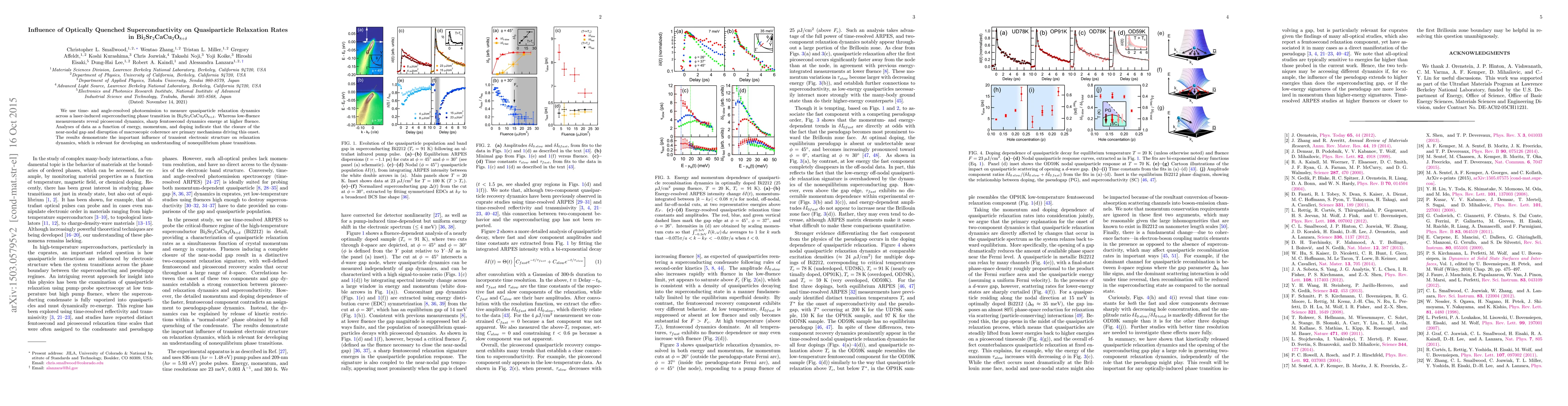 We use time- and angle-resolved photoemission to measure quasiparticle relaxation dynamics across a laser-induced superconducting phase transition in Bi2Sr2CaCu2O8+delta. Whereas low-fluence measurements reveal picosecond dynamics, sharp femtosecond dynamics emerge at higher fluence. Analyses of data as a function of energy, momentum, and doping indicate that the closure of the near-nodal gap and disruption of macroscopic coherence are primary mechanisms driving this onset. The results demonstrate the important influence of transient electronic structure on relaxation dynamics, which is relevant for developing an understanding of nonequilibrium phase transitions.