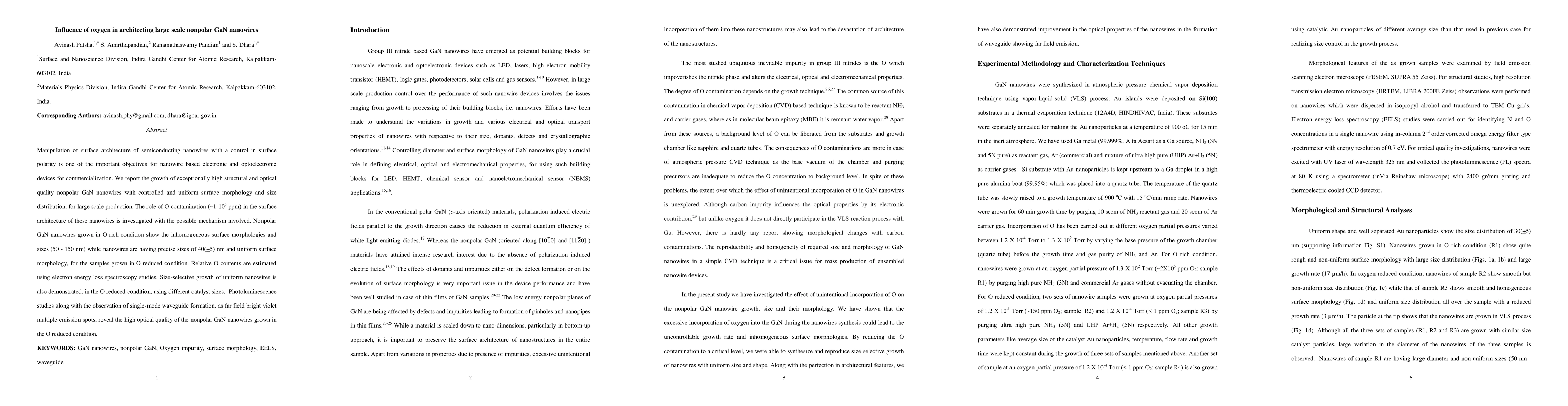 Manipulation of surface architecture of semiconducting nanowires with a control in surface polarity is one of the important objectives for nanowire based electronic and optoelectronic devices for commercialization. We report the growth of exceptionally high structural and optical quality nonpolar GaN nanowires with controlled and uniform surface morphology and size distribution, for large scale production. The role of O contamination (~1-10^5 ppm) in the surface architecture of these nanowires is investigated with the possible mechanism involved. Nonpolar GaN nanowires grown in O rich condition show the inhomogeneous surface morphologies and sizes (50 - 150 nm) while nanowires are having precise sizes of 40(5) nm and uniform surface morphology, for the samples grown in O reduced condition. Relative O contents are estimated using electron energy loss spectroscopy studies. Size-selective growth of uniform nanowires is also demonstrated, in the O reduced condition, using different catalyst sizes. Photoluminescence studies along with the observation of single-mode waveguide formation, as far field bright violet multiple emission spots, reveal the high optical quality of the nonpolar GaN nanowires grown in the O reduced condition.