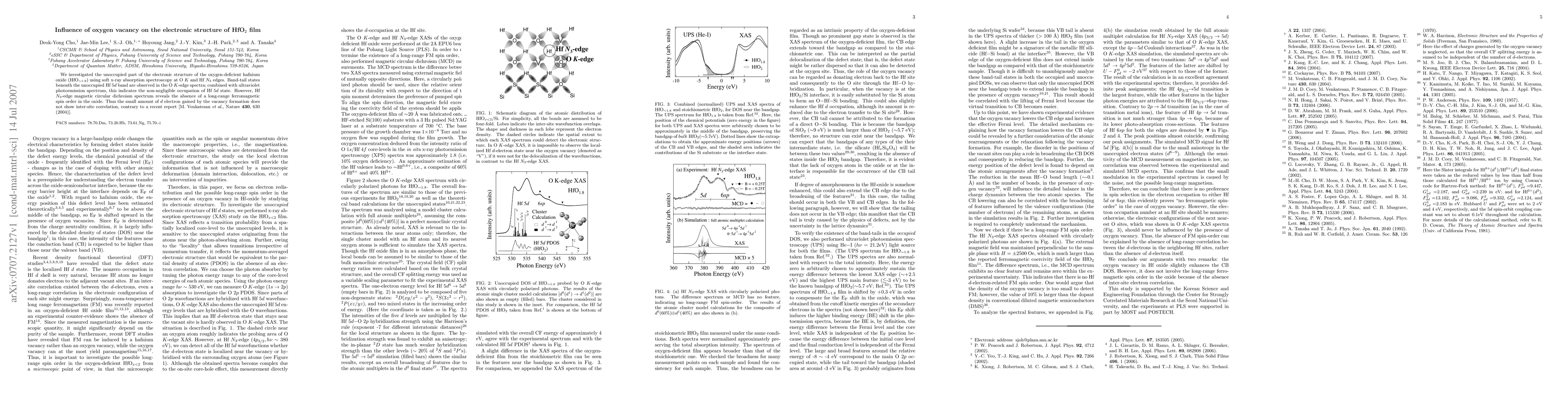 We investigated the unoccupied part of the electronic structure of the oxygen-deficient hafnium oxide (HfO$_{\sim1.8}$) using soft x-ray absorption spectroscopy at O $K$ and Hf $N_3$ edges. Band-tail states beneath the unoccupied Hf 5$d$ band are observed in the O $K$-edge spectra; combined with ultraviolet photoemission spectrum, this indicates the non-negligible occupation of Hf 5$d$ state. However, Hf $N_3$-edge magnetic circular dichroism spectrum reveals the absence of a long-range ferromagnetic spin order in the oxide. Thus the small amount of $d$ electron gained by the vacancy formation does not show inter-site correlation, contrary to a recent report [M. Venkatesan {\it et al.}, Nature {\bf 430}, 630 (2004)].