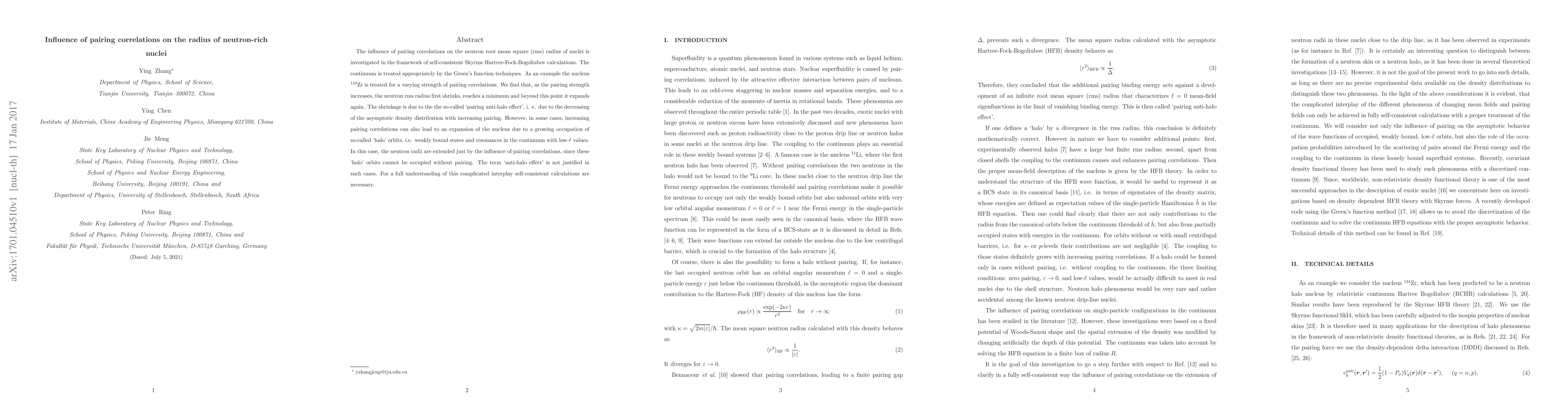 The influence of pairing correlations on the neutron root mean square (rms) radius of nuclei is investigated in the framework of self-consistent Skyrme Hartree-Fock-Bogoliubov calculations. The continuum is treated appropriately by the Green's function techniques. As an example the nucleus $^{124}$Zr is treated for a varying strength of pairing correlations. We find that, as the pairing strength increases, the neutron rms radius first shrinks, reaches a minimum and beyond this point it expands again. The shrinkage is due to the the so-called `pairing anti-halo effect', i. e. due to the decreasing of the asymptotic density distribution with increasing pairing. However, in some cases, increasing pairing correlations can also lead to an expansion of the nucleus due to a growing occupation of so-called `halo' orbits, i.e. weakly bound states and resonances in the continuum with low-$\ell $ values. In this case, the neutron radii are extended just by the influence of pairing correlations, since these `halo' orbits cannot be occupied without pairing. The term `anti-halo effect' is not justified in such cases. For a full understanding of this complicated interplay self-consistent calculations are necessary.