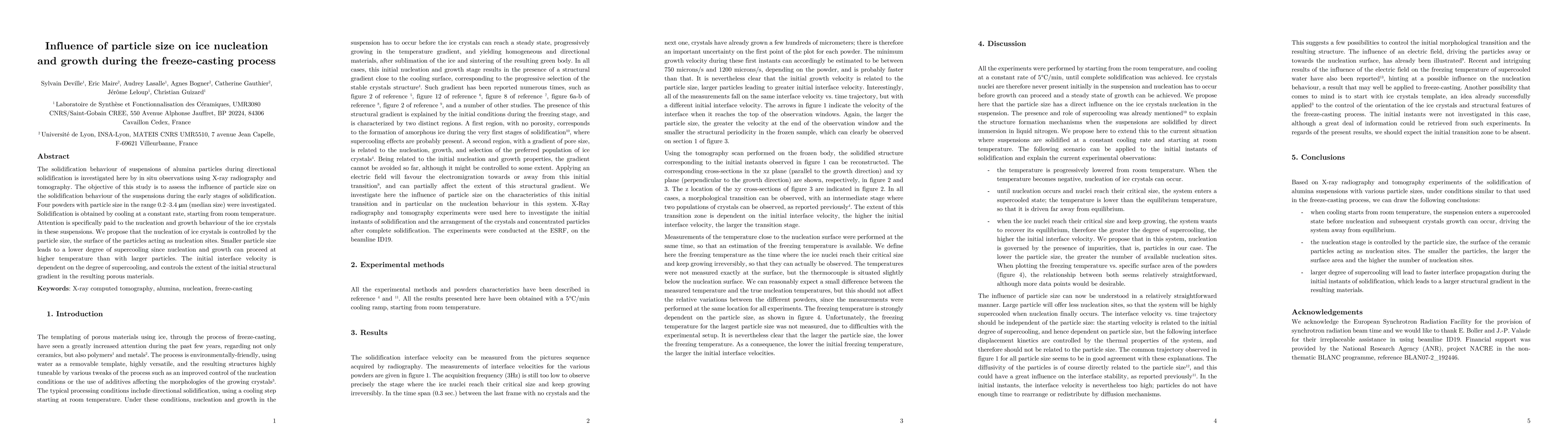 This study investigates how varying particle sizes of alumina influence the nucleation and growth of ice crystals during the freeze-casting process, using X-ray radiography and tomography. Smaller particles promote earlier nucleation and growth at higher temperatures, affecting the initial interface velocity and structural gradient in the resulting porous material.