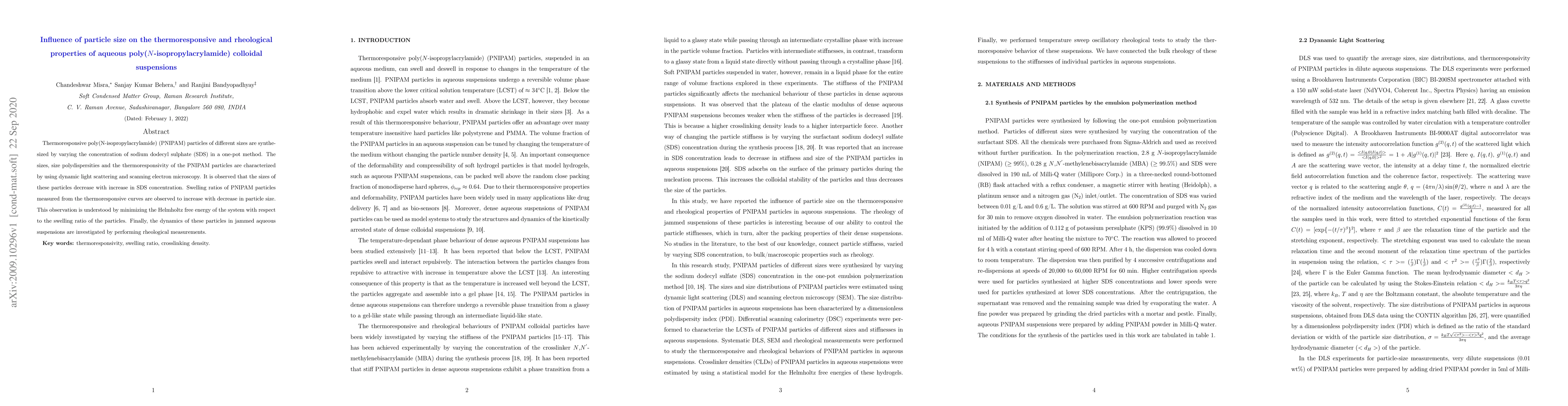 This study synthesizes thermoresponsive PNIPAM particles of varying sizes using SDS, finding smaller particles exhibit higher swelling ratios. Rheological measurements reveal the dynamics of these particles in aqueous suspensions, highlighting the influence of particle size on their thermoresponsive and rheological properties.