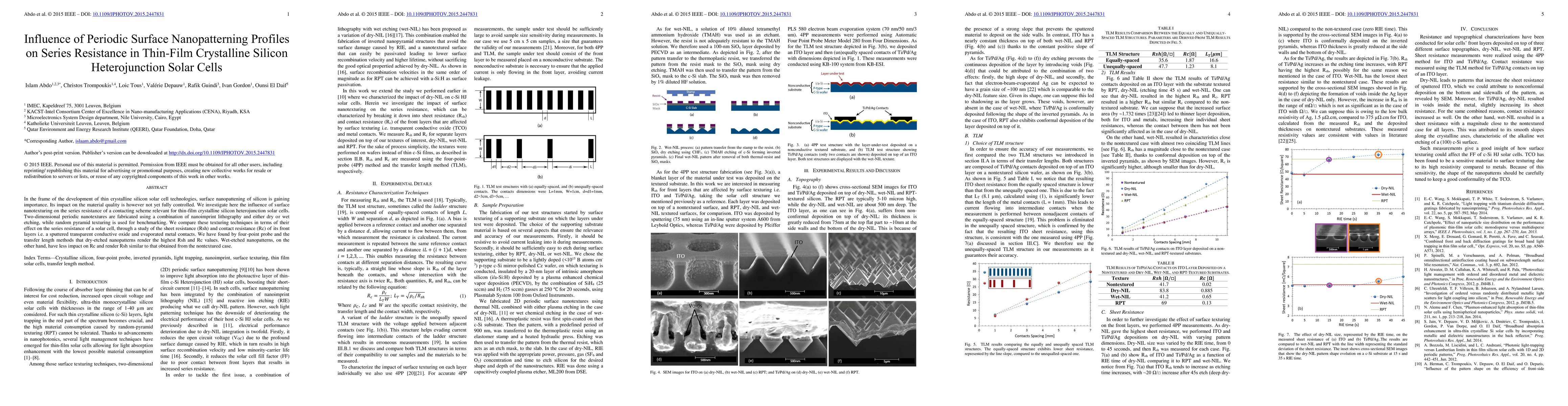 This study investigates the impact of different surface nanopatterning techniques on the series resistance of thin-film crystalline silicon heterojunction solar cells. Dry-etched nanopatterns increase sheet resistance and contact resistance, while wet-etched nanopatterns have a lesser effect on contact resistance but maintain similar sheet resistance compared to nontextured surfaces.