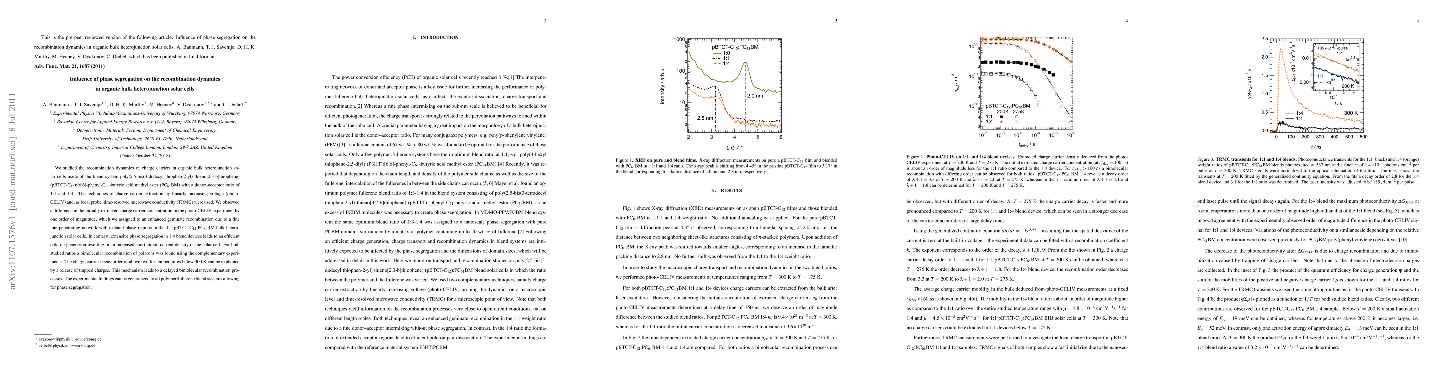 This study investigates recombination dynamics in organic bulk-heterojunction solar cells using photo-CELIV and TRMC techniques. Enhanced geminate recombination due to fine interpenetration in 1:1 blends leads to lower charge carrier concentration, while extensive phase segregation in 1:4 blends boosts polaron generation and short circuit current density. Both blends show bimolecular recombination, with charge carrier decay order above two at low temperatures indicating delayed recombination due to trapped charge release.