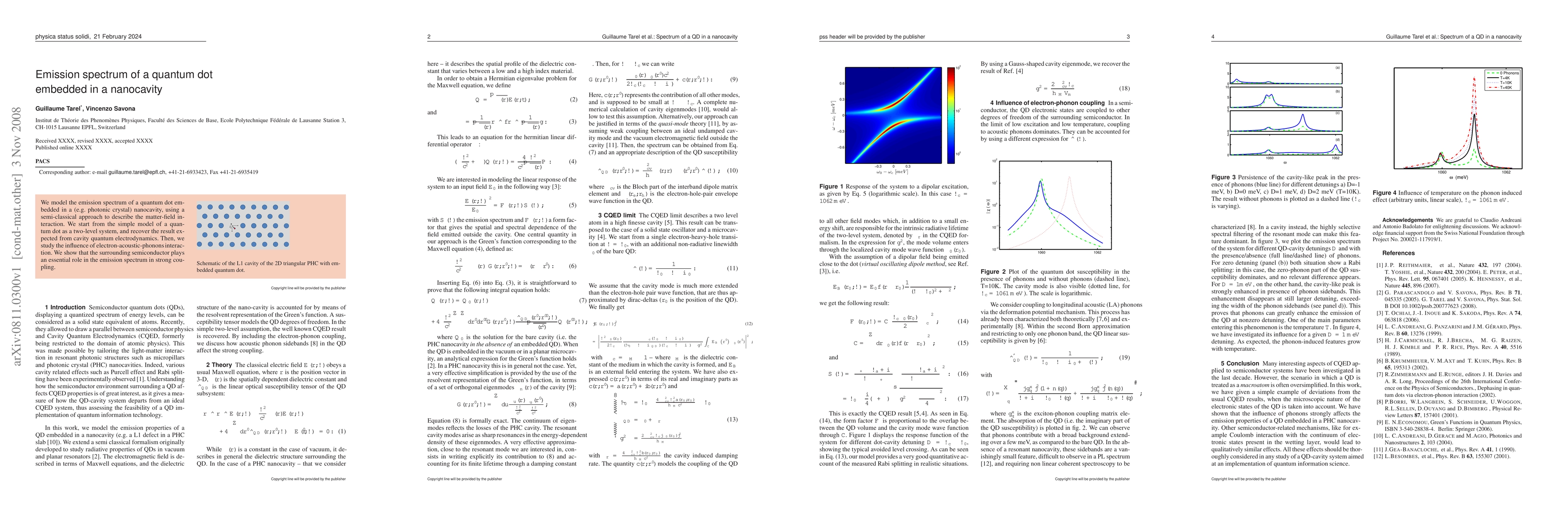 Summary: This study models the emission spectrum of a quantum dot in a nanocavity, revealing the essential role of electron-acoustic phonons in the interaction, which significantly influences the spectrum in strong coupling conditions.