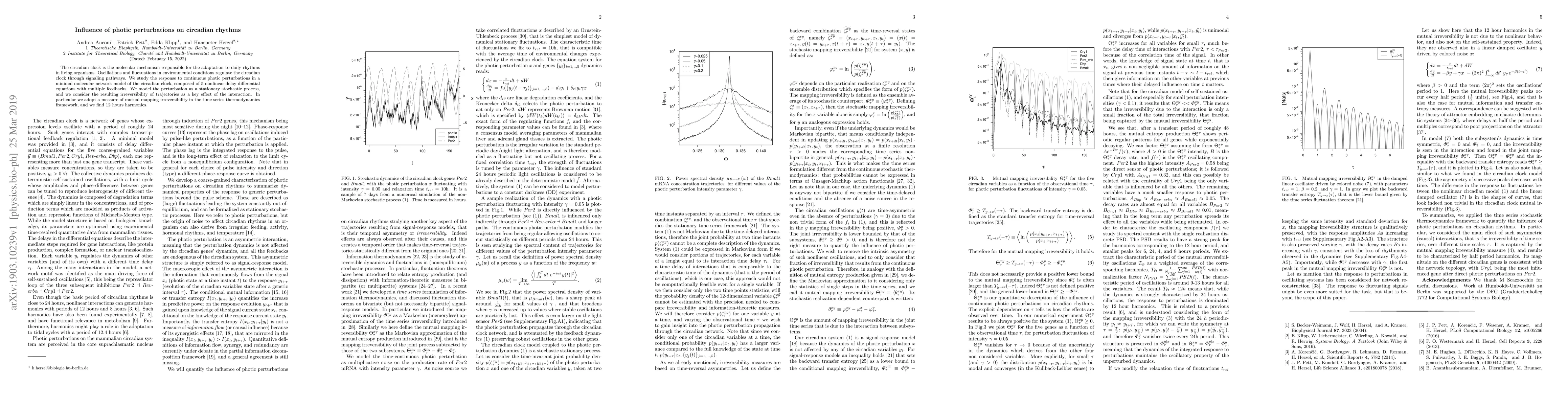 This paper investigates the impact of continuous photic perturbations on circadian rhythms using a minimal molecular network model. It finds that the stochastic perturbations induce irreversibility in the system's trajectories, revealing 12-hour harmonics in the response.