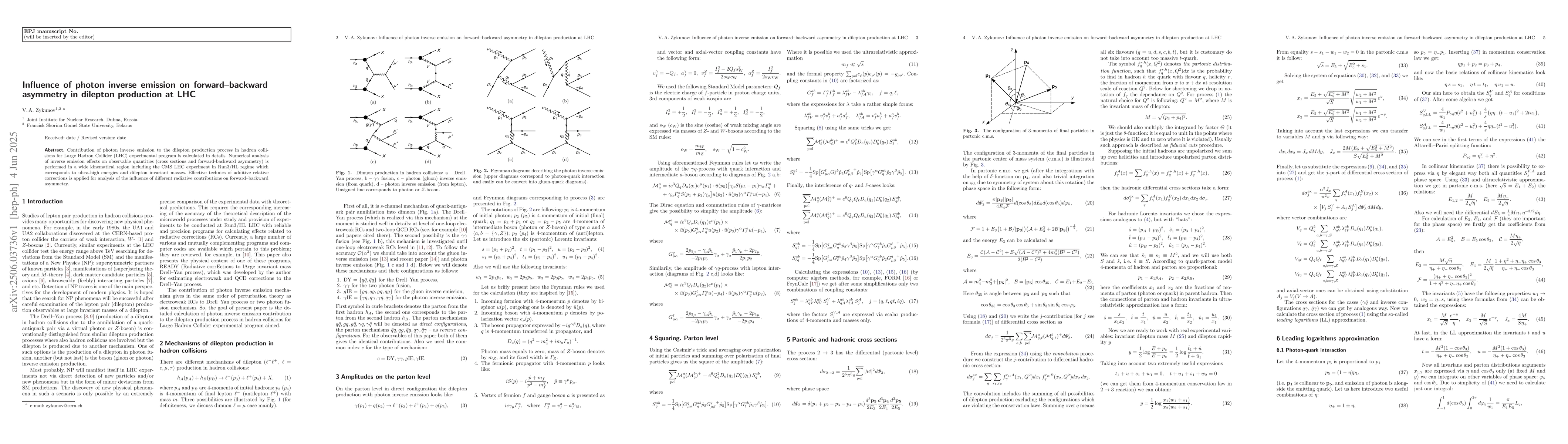 Contribution of photon inverse emission to the dilepton production process in hadron collisions for Large Hadron Collider (LHC) experimental program is calculated in details. Numerical analysis of inverse emission effects on observable quantities (cross sections and forward-backward asymmetry) is performed in a wide kinematical region including the CMS LHC experiment in Run3/HL regime which corresponds to ultra-high energies and dilepton invariant masses. Effective technics of additive relative corrections is applied for analysis of the influence of different radiative contributions on forward-backward asymmetry.