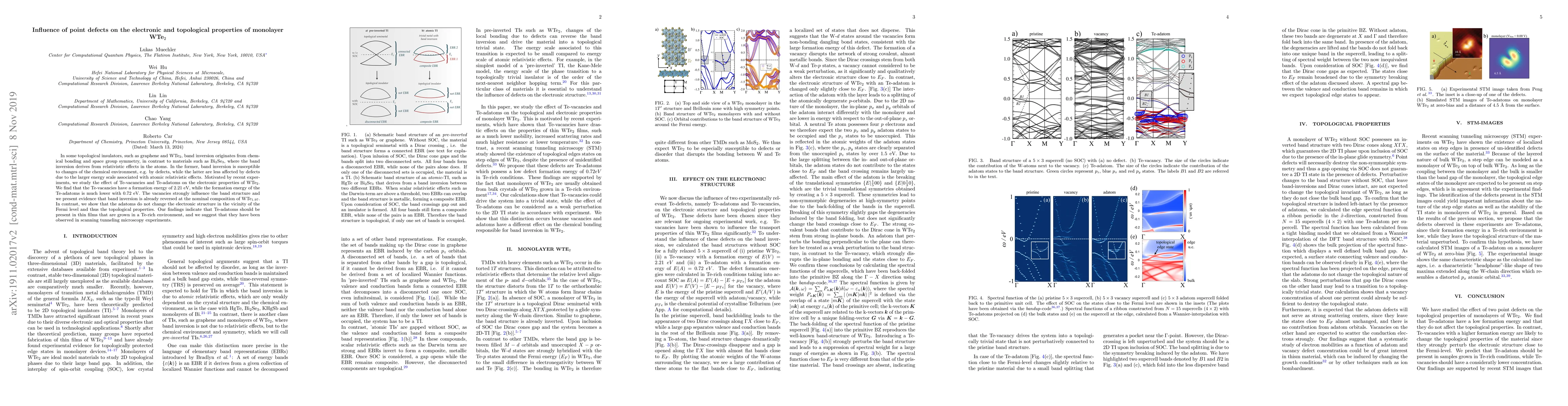 This paper investigates how Te-vacancies and Te-adatoms affect the electronic and topological properties of monolayer WTe$_2$. It finds that Te-vacancies reverse band inversion at WTe$_{1.97}$, while Te-adatoms, which are more easily formed, do not alter the topological properties near the Fermi level.