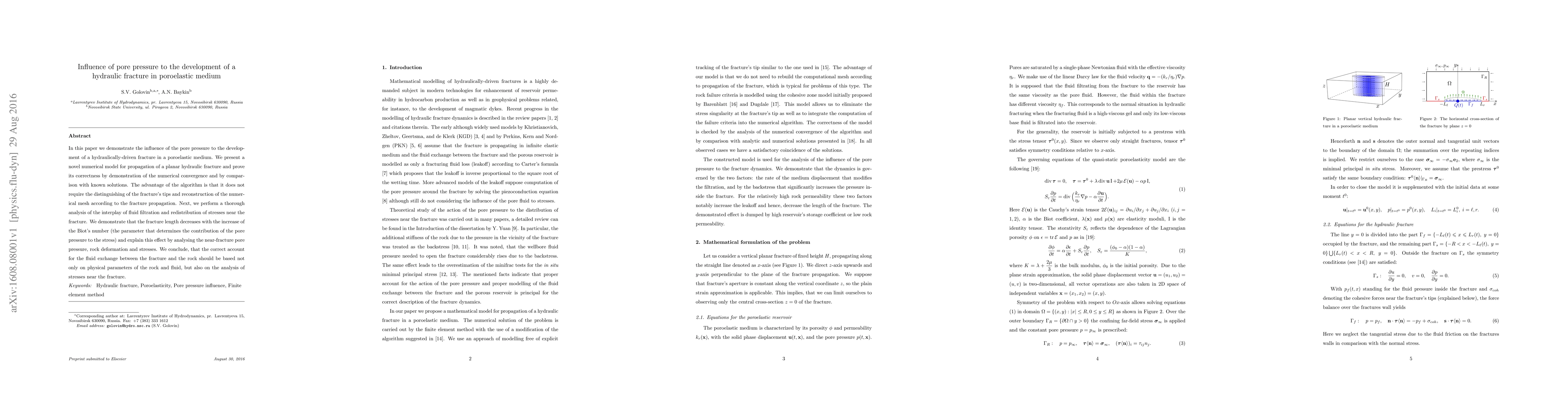 This paper presents a novel numerical model to study the influence of pore pressure on the development of hydraulic fractures in poroelastic media, showing that increased pore pressure reduces fracture length by altering stress distribution and fluid dynamics near the fracture.