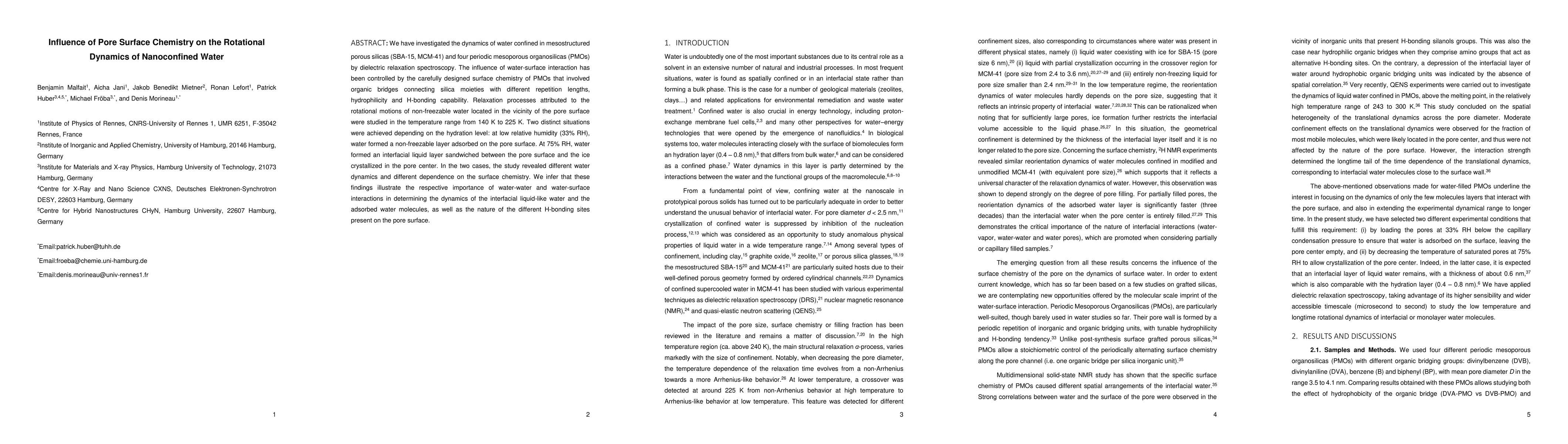 This study explores the rotational dynamics of nanoconfined water in mesostructured porous silicas and mesoporous organosilicas using dielectric relaxation spectroscopy. The research highlights how varying pore surface chemistry influences water dynamics, revealing distinct rotational behaviors depending on hydration levels and surface interactions.