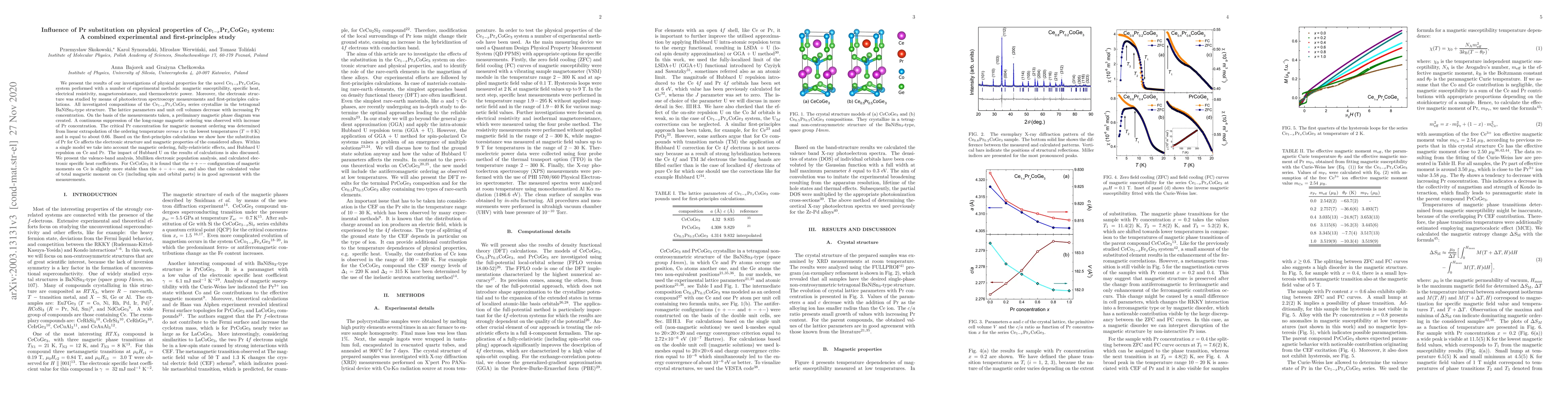 We present the results of our investigations of physical properties for the novel Ce$_{1-x}$Pr$_x$CoGe$_3$ system performed with a number of experimental methods: magnetic susceptibility, specific heat, electrical resistivity, magnetoresistance, and thermoelectric power. Moreover, the electronic structure was studied by means of photoelectron spectroscopy measurements and first-principles calculations. All investigated compositions of the Ce$_{1-x}$Pr$_x$CoGe$_3$ series crystallize in the tetragonal BaNiSn$_3$-type structure. The lattice parameters and unit cell volumes decrease with increasing Pr concentration. On the basis of the measurements taken, a preliminary magnetic phase diagram was created. A continuous suppression of the long-range magnetic ordering was observed with increase of Pr concentration. The critical Pr concentration for magnetic moment ordering was determined from linear extrapolation of the ordering temperature $versus$ $x$ to the lowest temperatures ($T = 0$ K) and is equal to about 0.66. Based on the first-principles calculations we show how the substitution of Pr for Ce affects the electronic structure and magnetic properties of the considered alloys. Within a single model we take into account the magnetic ordering, fully-relativistic effects, and Hubbard U repulsion on Ce and Pr. The impact of Hubbard U on the results of calculations is also discussed. We present the valence-band analysis, Mulliken electronic population analysis, and calculated electronic specific heat coefficients. For CeCoGe$_3$ it is found that the $++--$ configuration of magnetic moments on Ce is slightly more stable than the $+-+-$ one, and also that the calculated value of total magnetic moment on Ce (including spin and orbital parts) is in good agreement with the measurements.