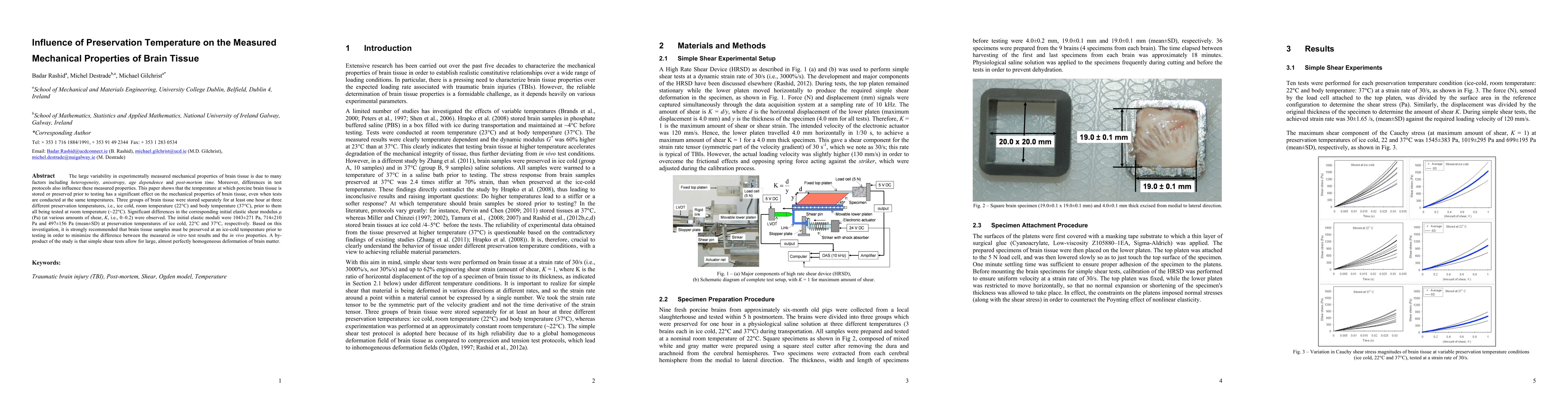 The large variability in experimentally measured mechanical properties of brain tissue is due to many factors including heterogeneity, anisotropy, age dependence and post-mortem time. Moreover, differences in test protocols also influence these measured properties. This paper shows that the temperature at which porcine brain tissue is stored or preserved prior to testing has a significant effect on the mechanical properties of brain tissue, even when tests are conducted at the same temperatures. Three groups of brain tissue were stored separately for at least one hour at three different preservation temperatures, i.e., ice cold, room temperature (22C) and body temperature (37C), prior to them all being tested at room temperature (approx. 22C). Significant differences in the corresponding initial elastic shear modulus mu (Pa) (at various amounts of shear, K, i.e., 0-0.2) were observed. The initial elastic moduli were 1043 +/- 271 Pa, 714 +/- 210 Pa and 497 +/- 156 Pa (mean +/- SD) at preservation temperatures of ice cold, 22C and 37C, respectively. Based on this investigation, it is strongly recommended that brain tissue samples must be preserved at an ice-cold temperature prior to testing in order to minimize the difference between the measured in vitro test results and the in vivo properties. A by-product of the study is that simple shear tests allow for large, almost perfectly homogeneous deformation of brain matter.