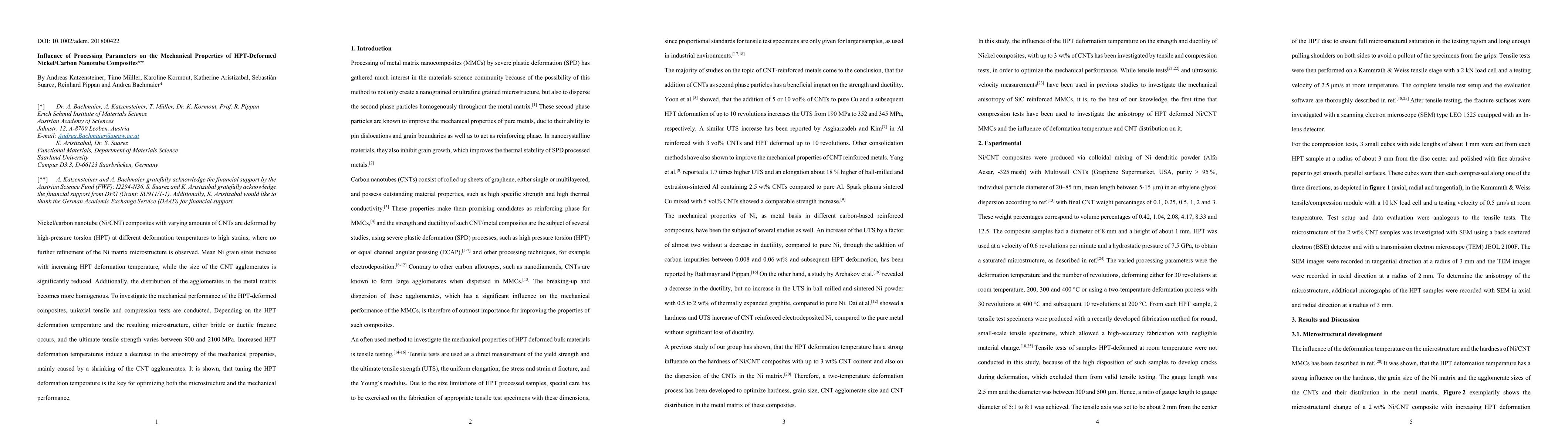 This study investigates the impact of high pressure torsion (HPT) deformation temperatures on the microstructure and mechanical properties of nickel carbon nanotube composites. Higher HPT temperatures increase nickel grain size and reduce carbon nanotube agglomerate size, leading to more homogenous distribution and improved mechanical performance, with ductile fracture observed at higher temperatures.
