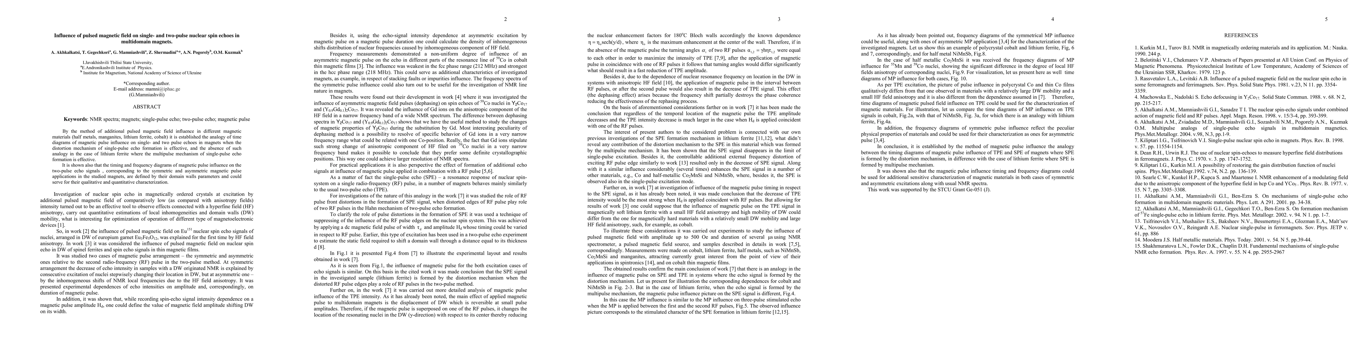 This paper investigates the effect of pulsed magnetic fields on single- and two-pulse nuclear spin echoes in various multidomain magnets, revealing an analogy in time diagrams for certain materials and distinct behavior in lithium ferrite. The study also demonstrates that the timing and frequency of two-pulse echoes are influenced by domain wall parameters, providing a method for their characterization.
