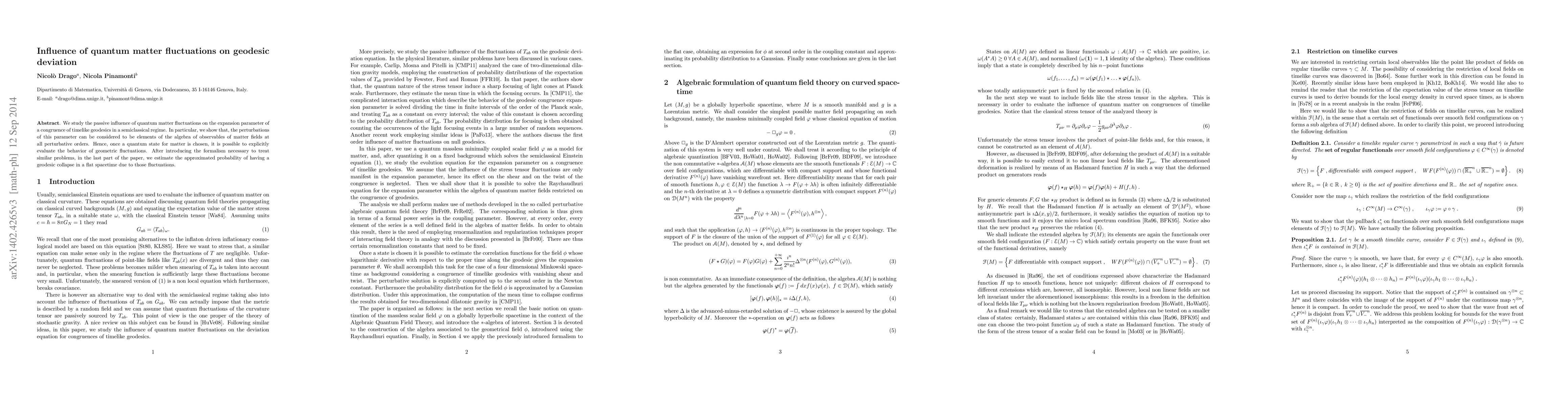 This paper investigates how quantum fluctuations in matter influence geodesic deviation in a semiclassical regime, finding that these fluctuations can be represented as elements of the algebra of matter fields.