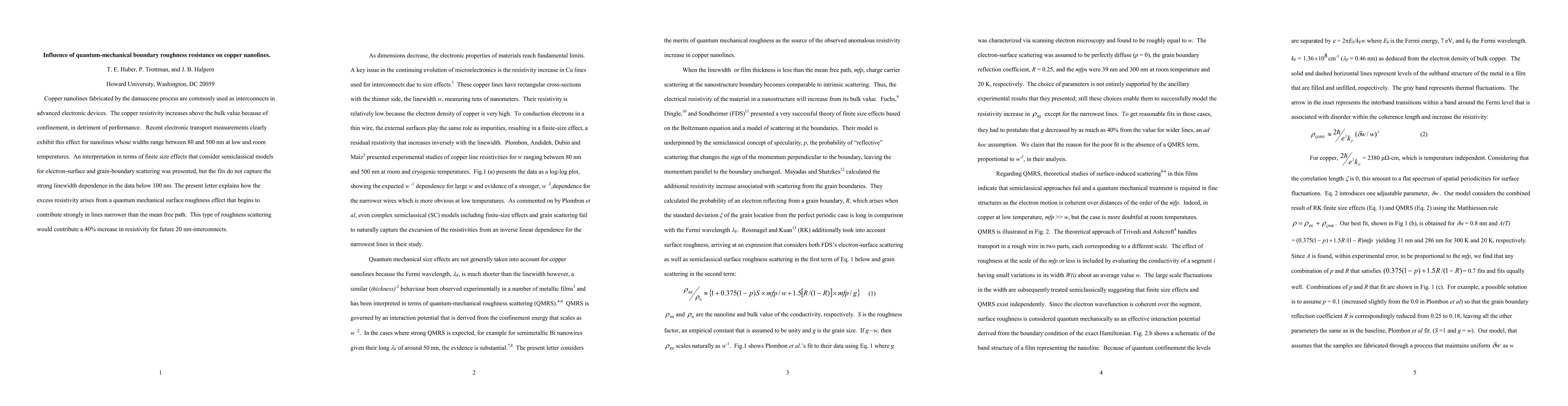 This paper explores how quantum-mechanical boundary roughness resistance affects copper nanolines used in electronic devices, revealing that resistivity increases significantly for lines narrower than 100 nm due to quantum mechanical scattering effects, potentially raising resistivity by 40% in future 20 nm interconnects.