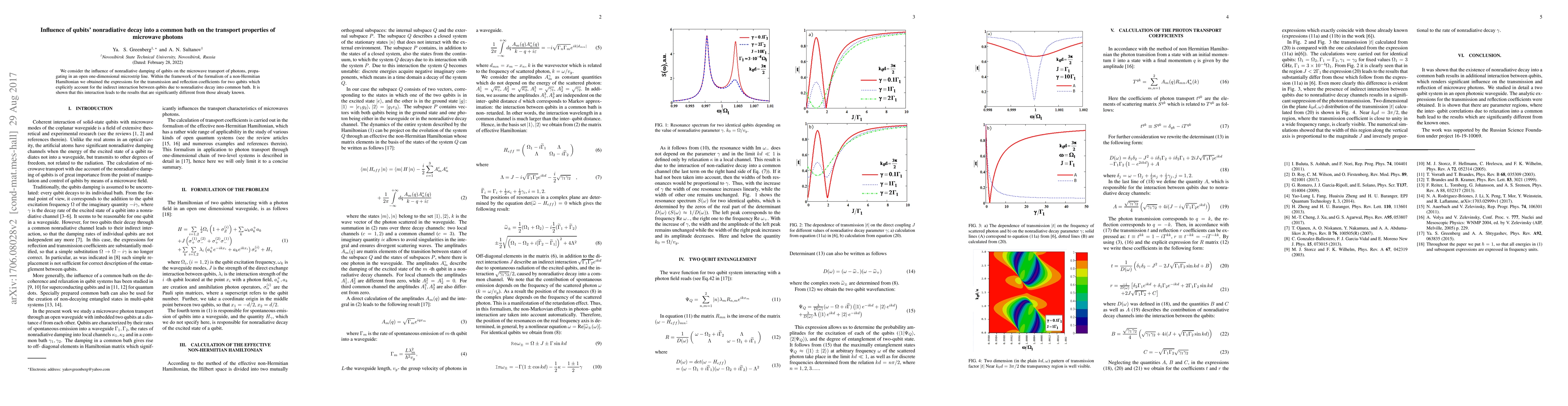 Summary: This study investigates how qubits' nonradiative decay into a common bath affects the transport properties of microwave photons in a microstrip line, revealing significant differences in transmission and reflection coefficients due to indirect qubit interactions mediated by the common bath.