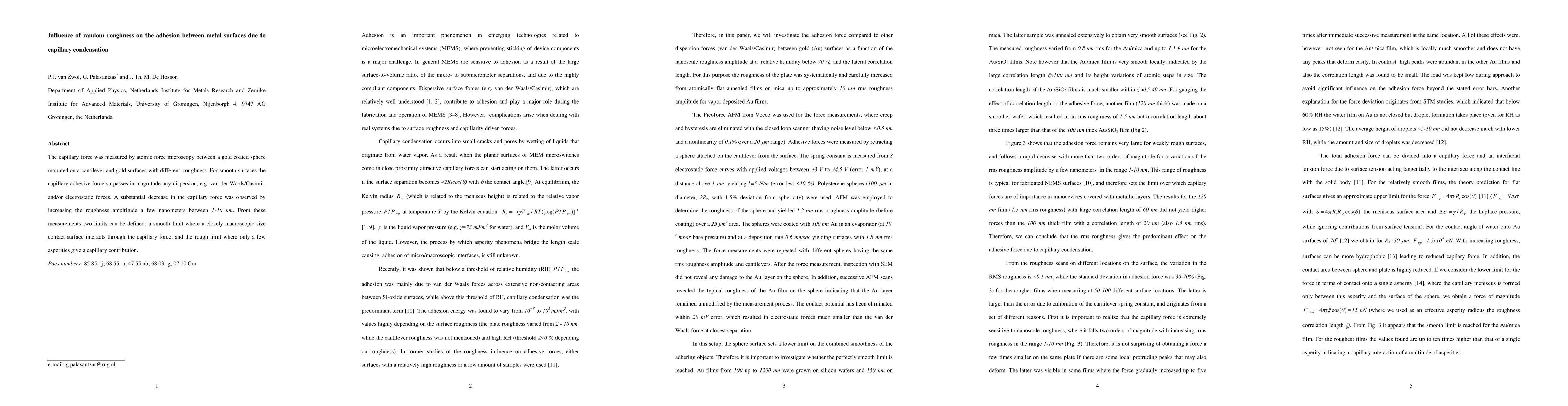 The paper presents a detailed study on the effect of random roughness on capillary adhesion between metal surfaces, utilizing precise AFM measurements and providing two defined limits for capillary force behavior.