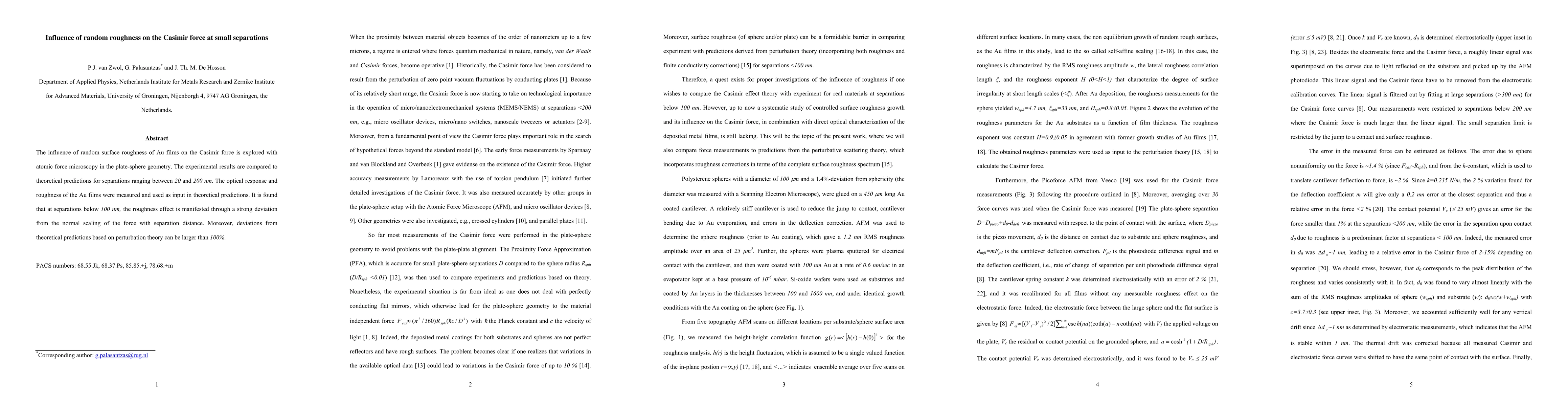 This study investigates how random roughness on Au films affects the Casimir force using atomic force microscopy, finding significant deviations from theoretical predictions at separations below 100 nm, with roughness causing force deviations exceeding 100%.