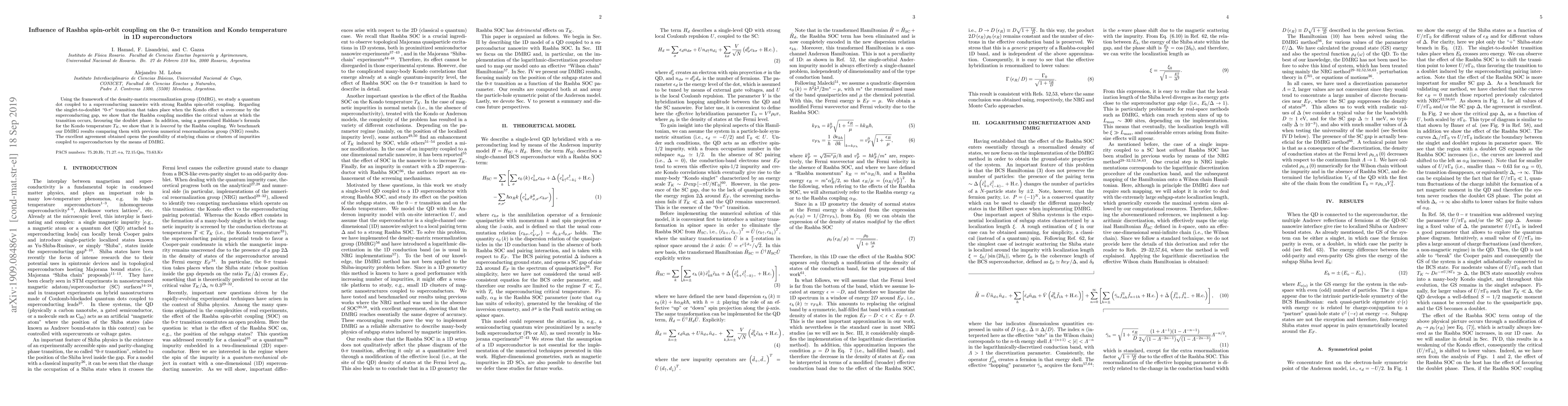 This paper investigates the impact of Rashba spin-orbit coupling on the "0-$\pi$" transition and Kondo temperature in 1D superconductors using DMRG. The study reveals that Rashba coupling favors the doublet phase during the transition and lowers the Kondo temperature $T_K$.