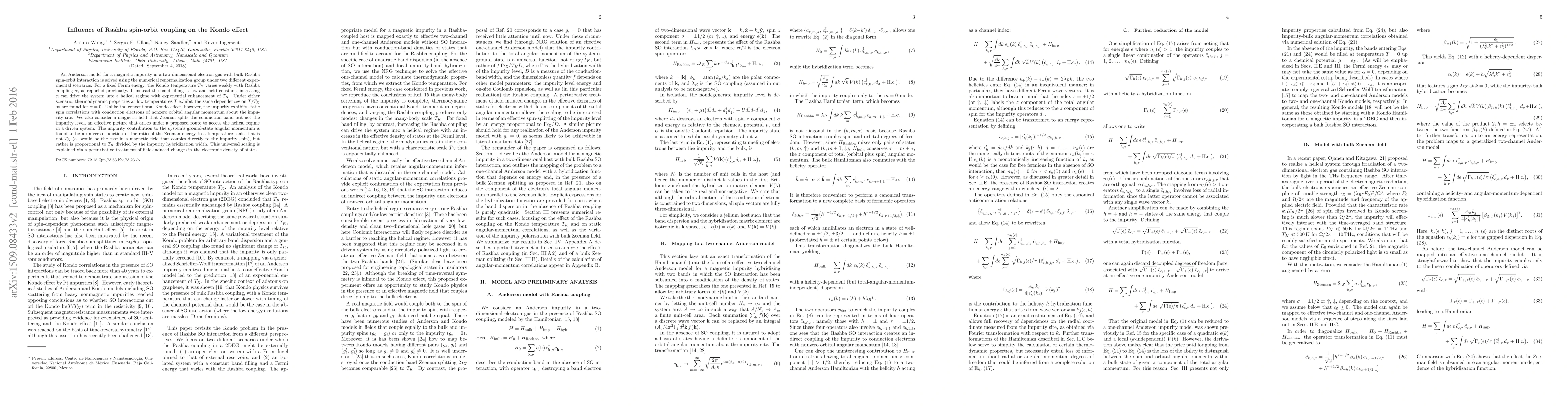 An Anderson model for a magnetic impurity in a two-dimensional electron gas with bulk Rashba spin-orbit interaction is solved using the numerical renormalization group under two different experimental scenarios. For a fixed Fermi energy, the Kondo temperature T_K varies weakly with Rashba coupling \alpha, as reported previously. If instead the band filling is low and held constant, increasing \alpha can drive the system into a helical regime with exponential enhancement of T_K. Under either scenario, thermodynamic properties at low temperatures T exhibit the same dependences on T/T_K as are found for \alpha = 0. Unlike the conventional Kondo effect, however, the impurity exhibits static spin correlations with conduction electrons of nonzero orbital angular momentum about the impurity site. We also consider a magnetic field that Zeeman splits the conduction band but not the impurity level, an effective picture that arises under a proposed route to access the helical regime in a driven system. The impurity contribution to the system's ground-state angular momentum is found to be a universal function of the ratio of the Zeeman energy to a temperature scale that is not T_K (as would be the case in a magnetic field that couples directly to the impurity spin), but rather is proportional to T_K divided by the impurity hybridization width. This universal scaling is explained via a perturbative treatment of field-induced changes in the electronic density of states.