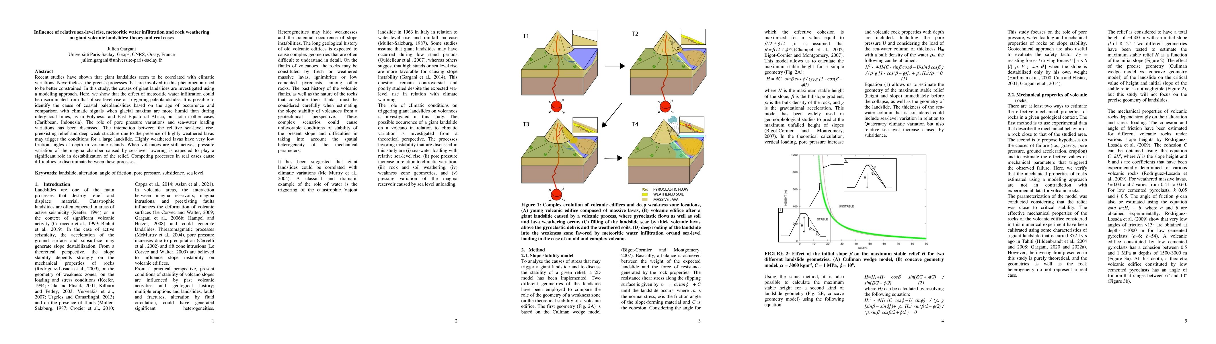 This study investigates the causes of giant volcanic landslides using modeling, revealing that meteoritic water infiltration and relative sea-level rise can trigger paleolandslides. The analysis shows that coastal landslides in humid glacial maxima regions like Polynesia and East Equatorial Africa are more likely to be influenced by these factors, while other regions like the Caribbean and Indonesia exhibit different triggering mechanisms.