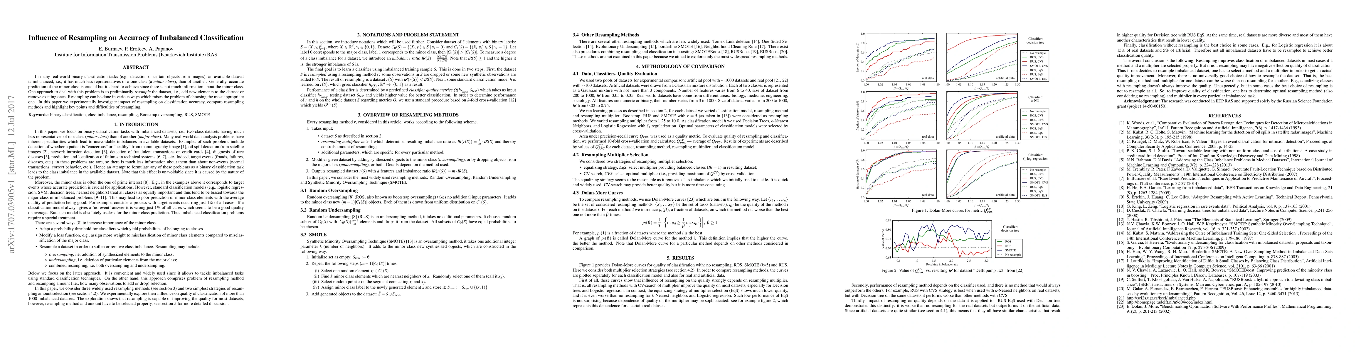 In many real-world binary classification tasks (e.g. detection of certain objects from images), an available dataset is imbalanced, i.e., it has much less representatives of a one class (a minor class), than of another. Generally, accurate prediction of the minor class is crucial but it's hard to achieve since there is not much information about the minor class. One approach to deal with this problem is to preliminarily resample the dataset, i.e., add new elements to the dataset or remove existing ones. Resampling can be done in various ways which raises the problem of choosing the most appropriate one. In this paper we experimentally investigate impact of resampling on classification accuracy, compare resampling methods and highlight key points and difficulties of resampling.