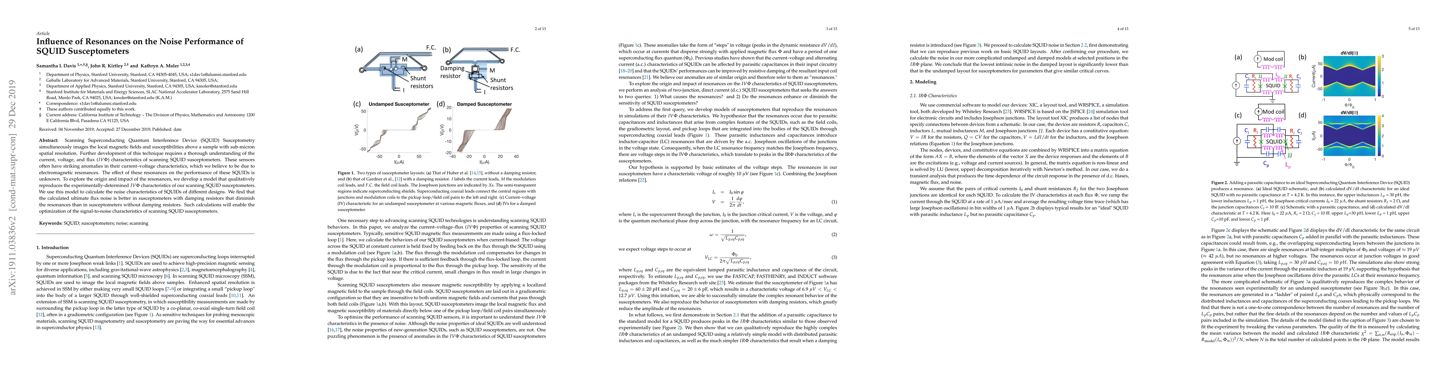 Scanning Superconducting Quantum Interference Device (SQUID) Susceptometry simultaneously images the local magnetic fields and susceptibilities above a sample with sub-micron spatial resolution. Further development of this technique requires a thorough understanding of the current, voltage, and flux characteristics of scanning SQUID susceptometers. These sensors often have striking anomalies in their current-voltage characteristics, which we believe to be due to electromagnetic resonances. The effect of these resonances on the performance of these SQUIDs is unknown. To explore the origin and impact of the resonances, we have developed a model that qualitatively reproduces the experimentally-determined current-voltage characteristics of our scanning SQUID susceptometers. We use this model to calculate the noise characteristics of SQUIDs of different designs. We find that the calculated ultimate flux noise is better in susceptometers with damping resistors that diminish the resonances than susceptometers without damping resistors. Such calculations will enable the optimization of the signal-to-noise characteristics of scanning SQUID susceptometers.