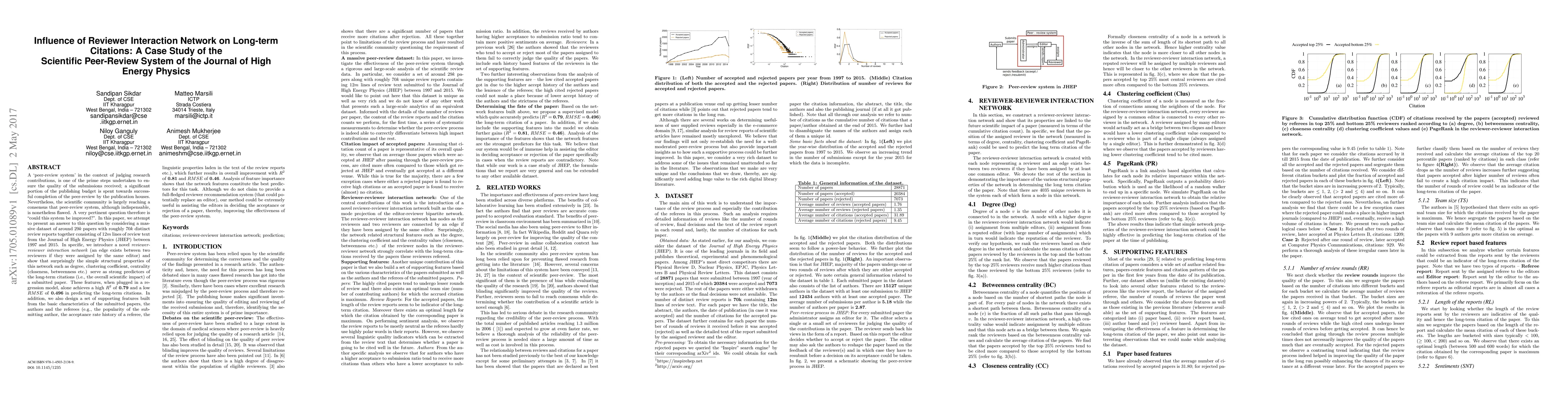 A `peer-review system' in the context of judging research contributions, is one of the prime steps undertaken to ensure the quality of the submissions received, a significant portion of the publishing budget is spent towards successful completion of the peer-review by the publication houses. Nevertheless, the scientific community is largely reaching a consensus that peer-review system, although indispensable, is nonetheless flawed. A very pertinent question therefore is "could this system be improved?". In this paper, we attempt to present an answer to this question by considering a massive dataset of around $29k$ papers with roughly $70k$ distinct review reports together consisting of $12m$ lines of review text from the Journal of High Energy Physics (JHEP) between 1997 and 2015. In specific, we introduce a novel \textit{reviewer-reviewer interaction network} (an edge exists between two reviewers if they were assigned by the same editor) and show that surprisingly the simple structural properties of this network such as degree, clustering coefficient, centrality (closeness, betweenness etc.) serve as strong predictors of the long-term citations (i.e., the overall scientific impact) of a submitted paper. These features, when plugged in a regression model, alone achieves a high $R^2$ of \0.79 and a low $RMSE$ of 0.496 in predicting the long-term citations. In addition, we also design a set of supporting features built from the basic characteristics of the submitted papers, the authors and the referees (e.g., the popularity of the submitting author, the acceptance rate history of a referee, the linguistic properties laden in the text of the review reports etc.), which further results in overall improvement with $R^2$ of 0.81 and $RMSE$ of 0.46.