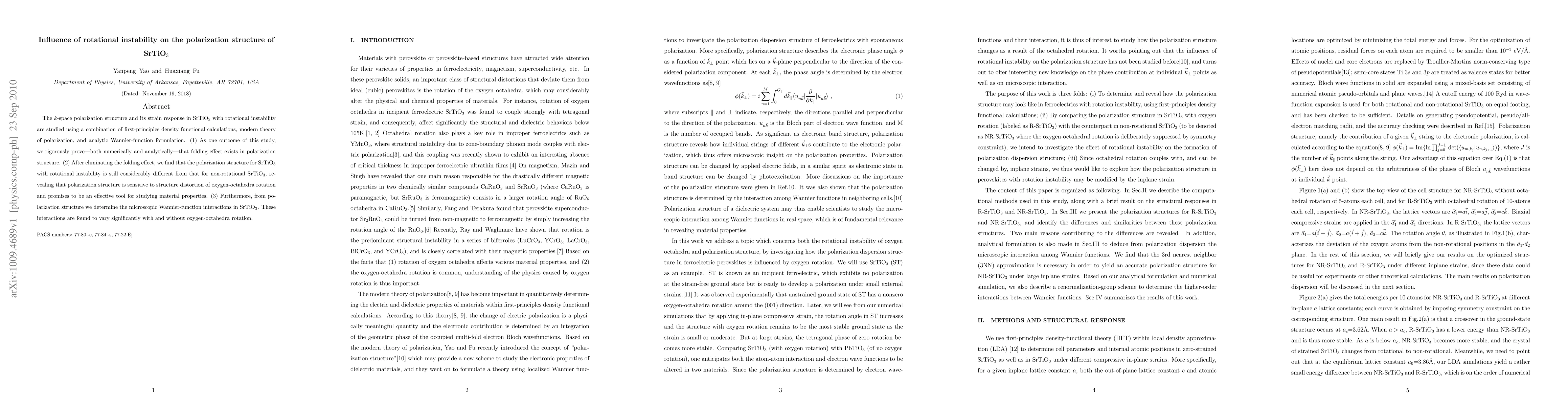 The k-space polarization structure and its strain response in SrTiO3 with rotational instability are studied using a combination of first-principles density functional calculations, modern theory of polarization, and analytic Wannier-function formulation. (1) As one outcome of this study, we rigorously prove-both numerically and analytically-that folding effect exists in polarization structure. (2) After eliminating the folding effect, we find that the polarization structure for SrTiO3 with rotational instability is still considerably different from that for non-rotational SrTiO3, revealing that polarization structure is sensitive to structure distortion of oxygen-octahedra rotation and promises to be an effective tool for studying material properties. (3) Furthermore, from polarization structure we determine the microscopic Wannier-function interactions in SrTiO3. These interactions are found to vary significantly with and without oxygen-octahedra rotation.