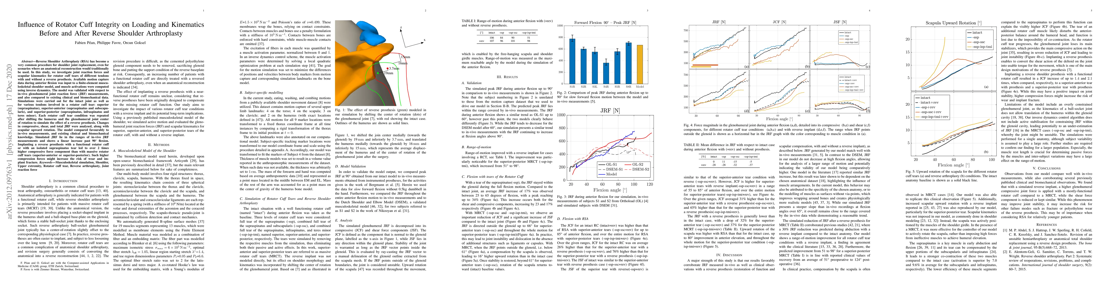 This study investigates how rotator cuff integrity affects joint reaction forces and scapular kinematics before and after reverse shoulder arthroplasty using a validated finite-element model. Results show that a functional rotator cuff or isolated supraspinatus tears lead to significantly higher compressive forces compared to massive rotator cuff tears, potentially increasing wear and implant fracture risk.