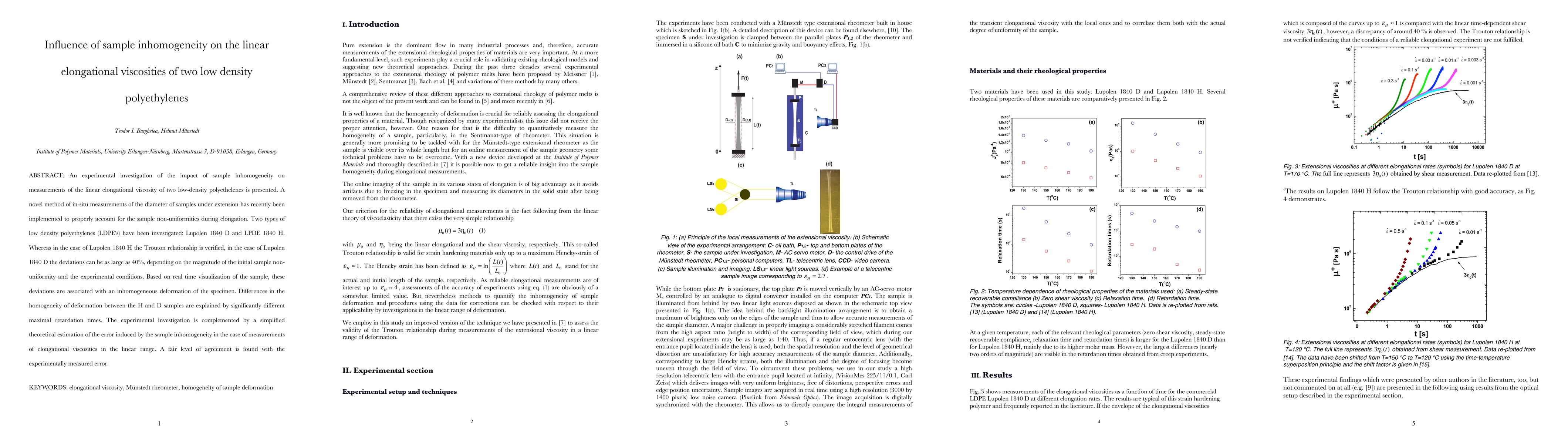 An experimental investigation of the impact of sample inhomogeneity on measurements of the linear elongational viscosity of two low-density polyethelenes is presented. A novel method of in-situ measurements of the diameter of samples under extension has recently been implemented to properly account for the sample non-uniformities during elongation. Two types of low density polyethylenes (LDPE's) have been investigated: Lupolen 1840 D and LPDE 1840 H. Whereas in the case of Lupolen 1840 H the Trouton relationship is verified, in the case of Lupolen 1840 D the deviations can be as large as 40%, depending on the magnitude of the initial sample non-uniformity and the experimental conditions. Based on real time visualization of the sample, these deviations are associated with an inhomogeneous deformation of the specimen. Differences in the homogeneity of deformation between the H and D samples are explained by significantly different maximal retardation times. The experimental investigation is complemented by a simplified theoretical estimation of the error induced by the sample inhomogeneity in the case of measurements of elongational viscosities in the linear range. A fair level of agreement is found with the experimentally measured error.