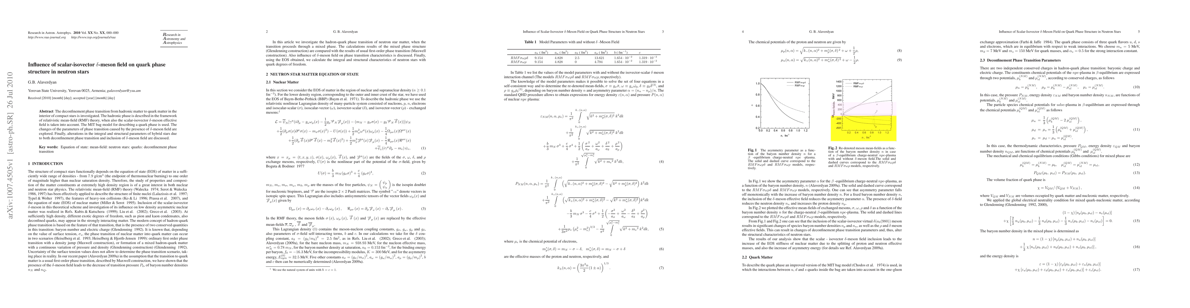 This paper investigates the impact of a scalar-isovector delta-meson field on the phase transition from hadronic to quark matter in neutron stars, using relativistic mean-field theory and the MIT bag model, and explores the resulting changes in hybrid star parameters.