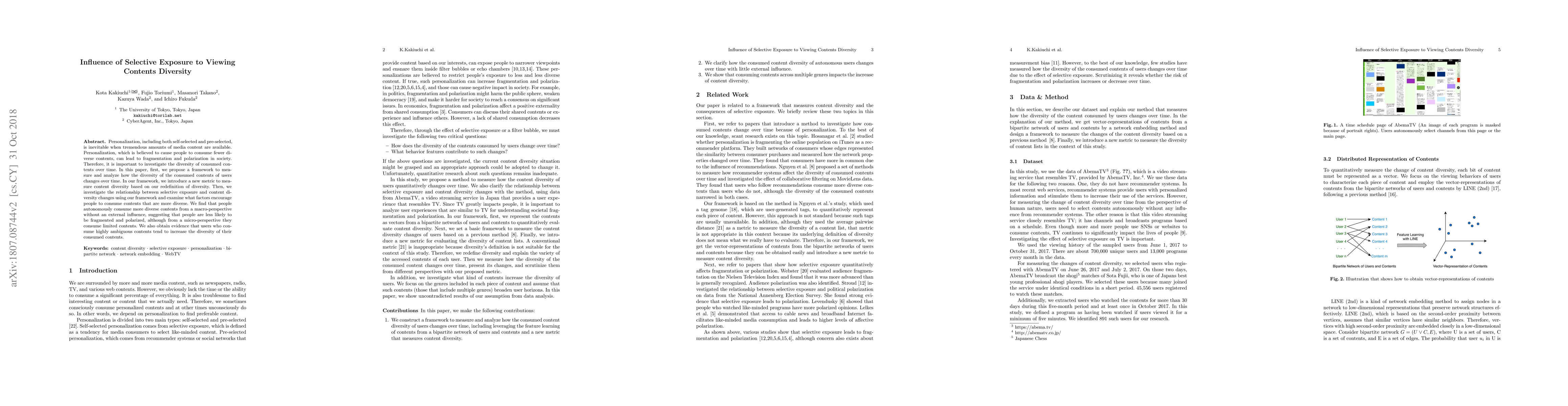 Personalization, including both self-selected and pre-selected, is inevitable when tremendous amounts of media content are available. Personalization, which is believed to cause people to consume fewer diverse contents, can lead to fragmentation and polarization in society. Therefore, it is important to investigate the diversity of consumed contents over time. In this paper, first, we propose a framework to measure and analyze how the diversity of the consumed contents of users changes over time. In our framework, we introduce a new metric to measure content diversity based on our redefinition of diversity. Then, we investigate the relationship between selective exposure and content diversity changes using our framework and examine what factors encourage people to consume contents that are more diverse. We find that people autonomously consume more diverse contents from a macro-perspective without an external influence, suggesting that people are less likely to be fragmented and polarized, although from a micro-perspective they consume limited contents. We also obtain evidence that users who consume highly ambiguous contents tend to increase the diversity of their consumed contents.